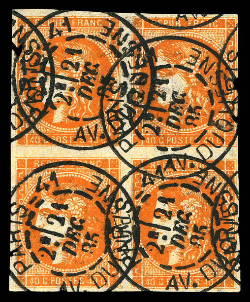 N°48, 40c orange, bloc de quatre obl càd, jolie couleur vive. TTB (certificat) Qualité: Oblitéré Cote: 5000 euros (Image)