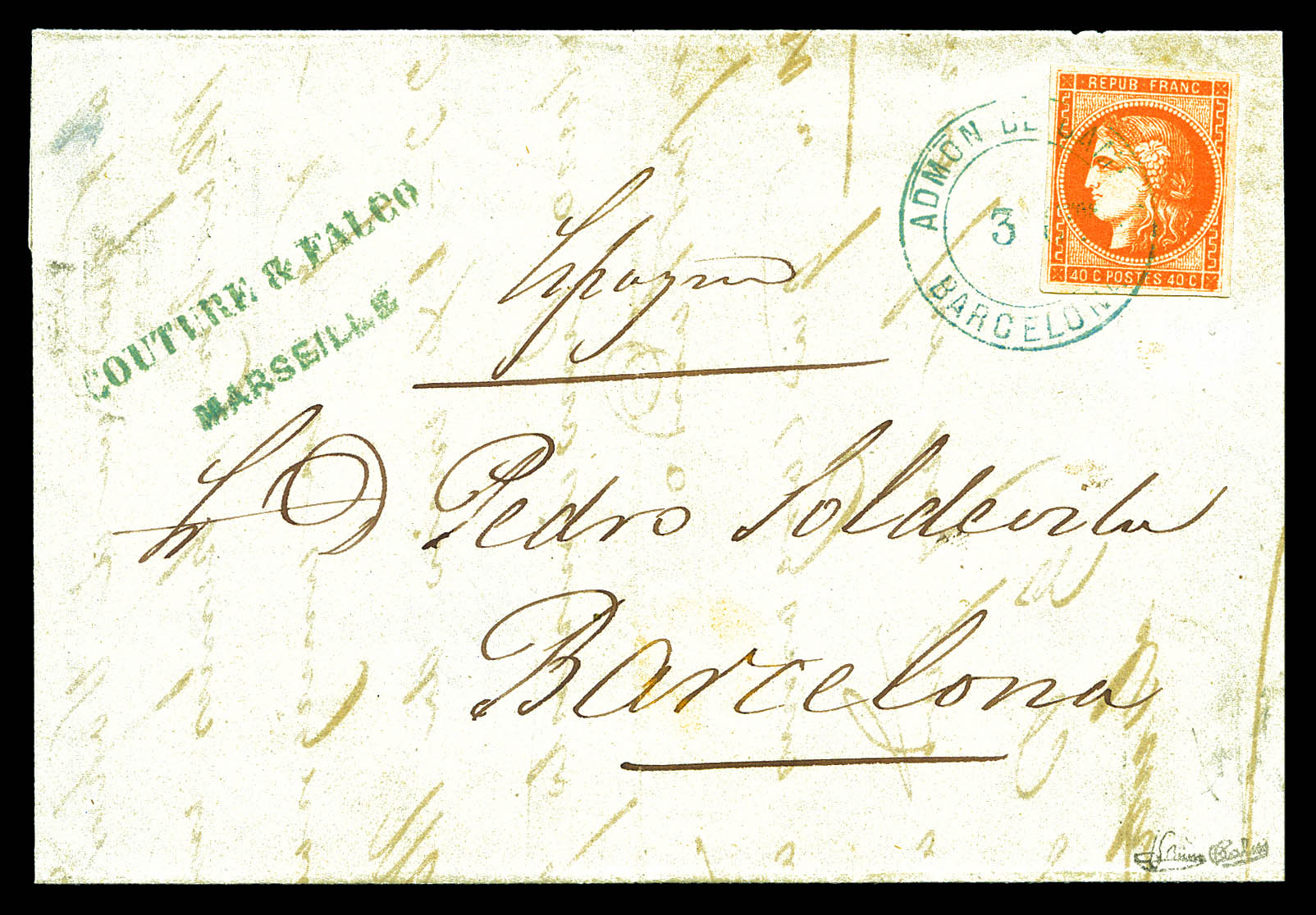 N°48, 40c orange obl ADMON DI CAMBIO/BARCELONA en bleu sur lettre de MARSEILLE pour Barcelone. SUPERBE. R.R. (signé Brun/Calves/certificat) Qualité: Oblitéré (Image)