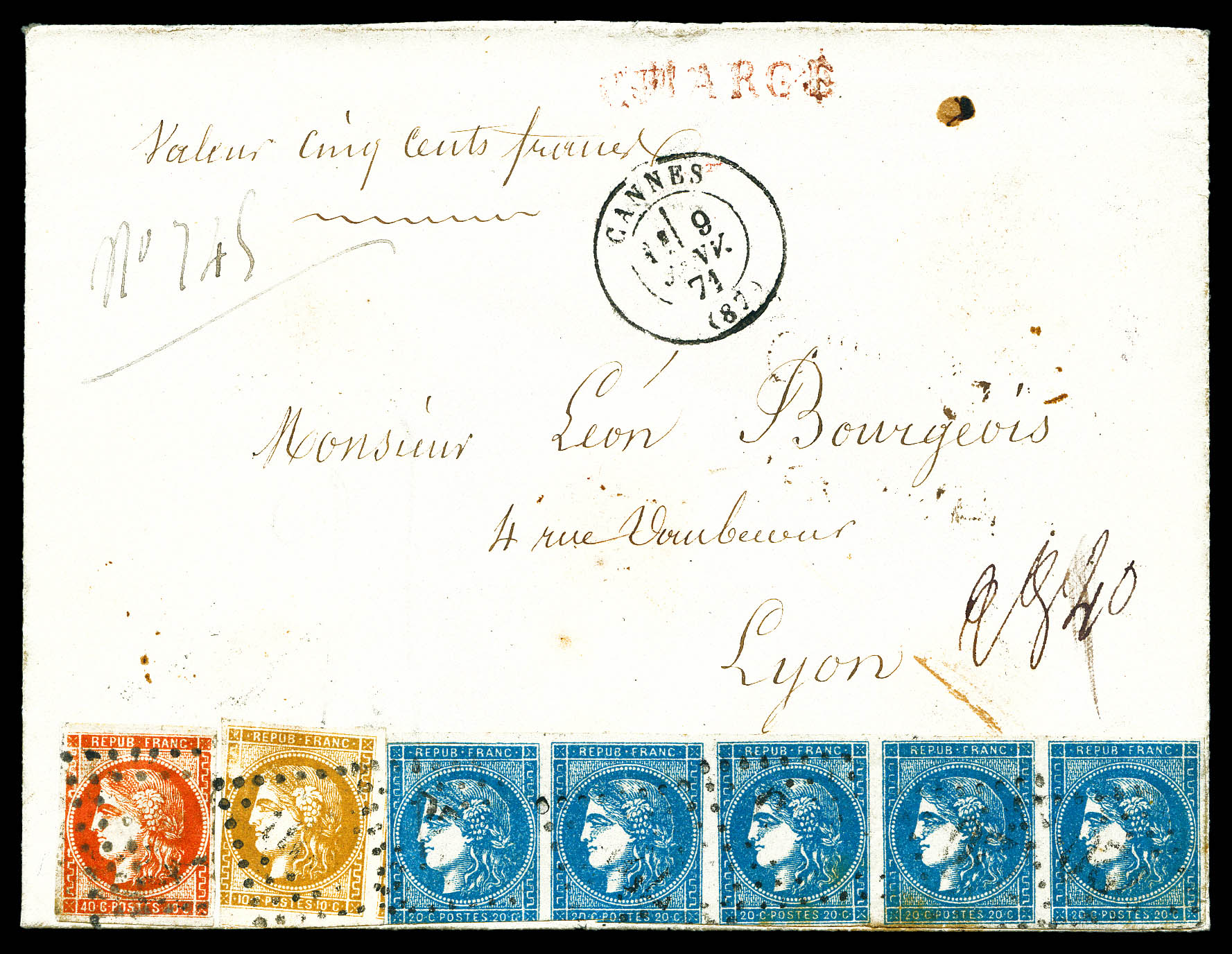 N°48 +45C en bande de 5 (2 ex. touché) +43A (touché) obl. GC sur lettre chargée de Cannes, Alpes-maritimes, 9 janvier 1871 pour Lyon, TB, RR lettre chargée tricolore tout en Bordeaux. (certificat) Qualité: