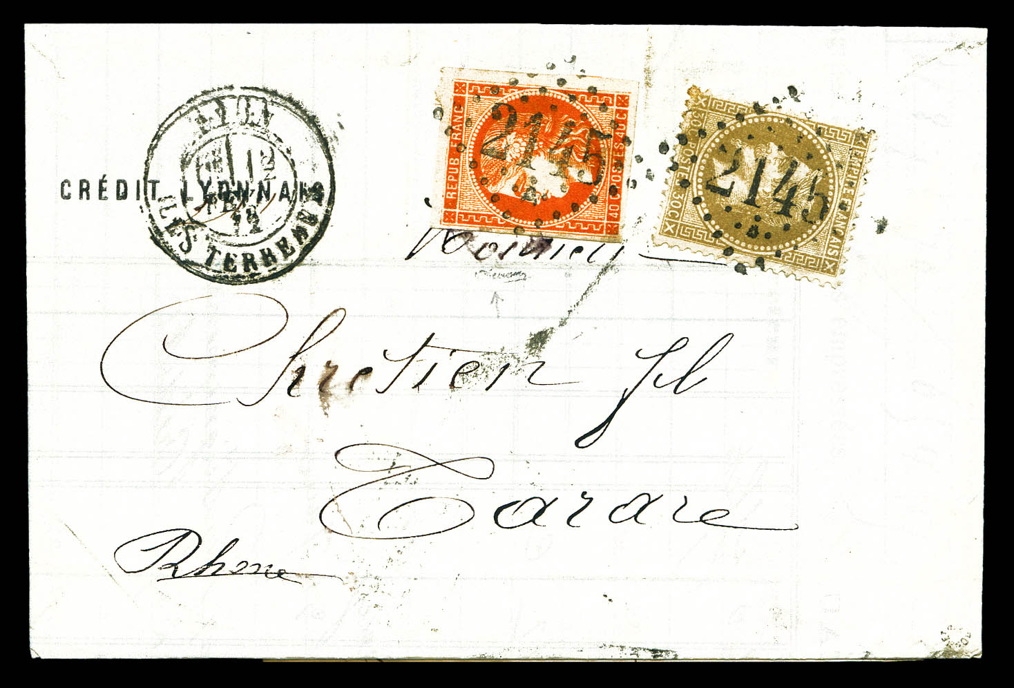 40c orange (N°48) + 30c brun (N°30) obl GC 2145 sur lettre du 13 Fev 1872 de LYON pour TARARE, TTB (certificat) Qualité: Oblitéré (Image)