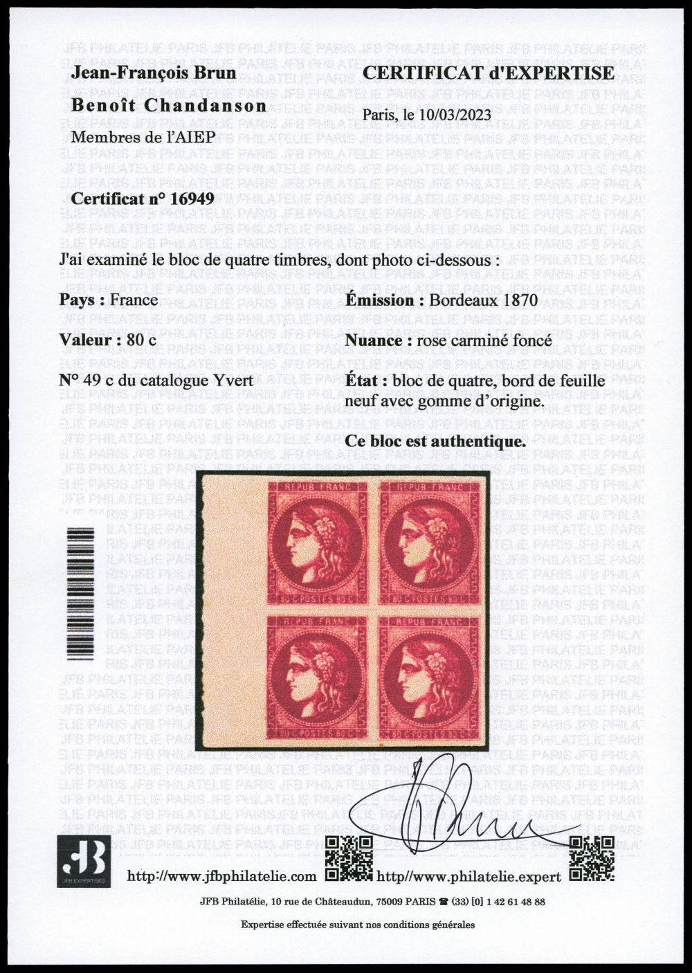 784 nh imageN°49h, 80c rose carminé foncé, couleur exceptionnelle, fraîcheur postale. SUP. R. (certificat) Qualité: ** (Image) (imagea) (All Images)
