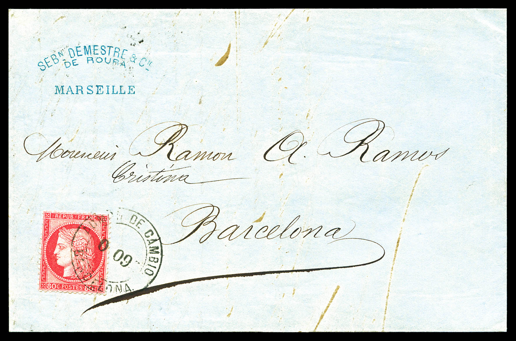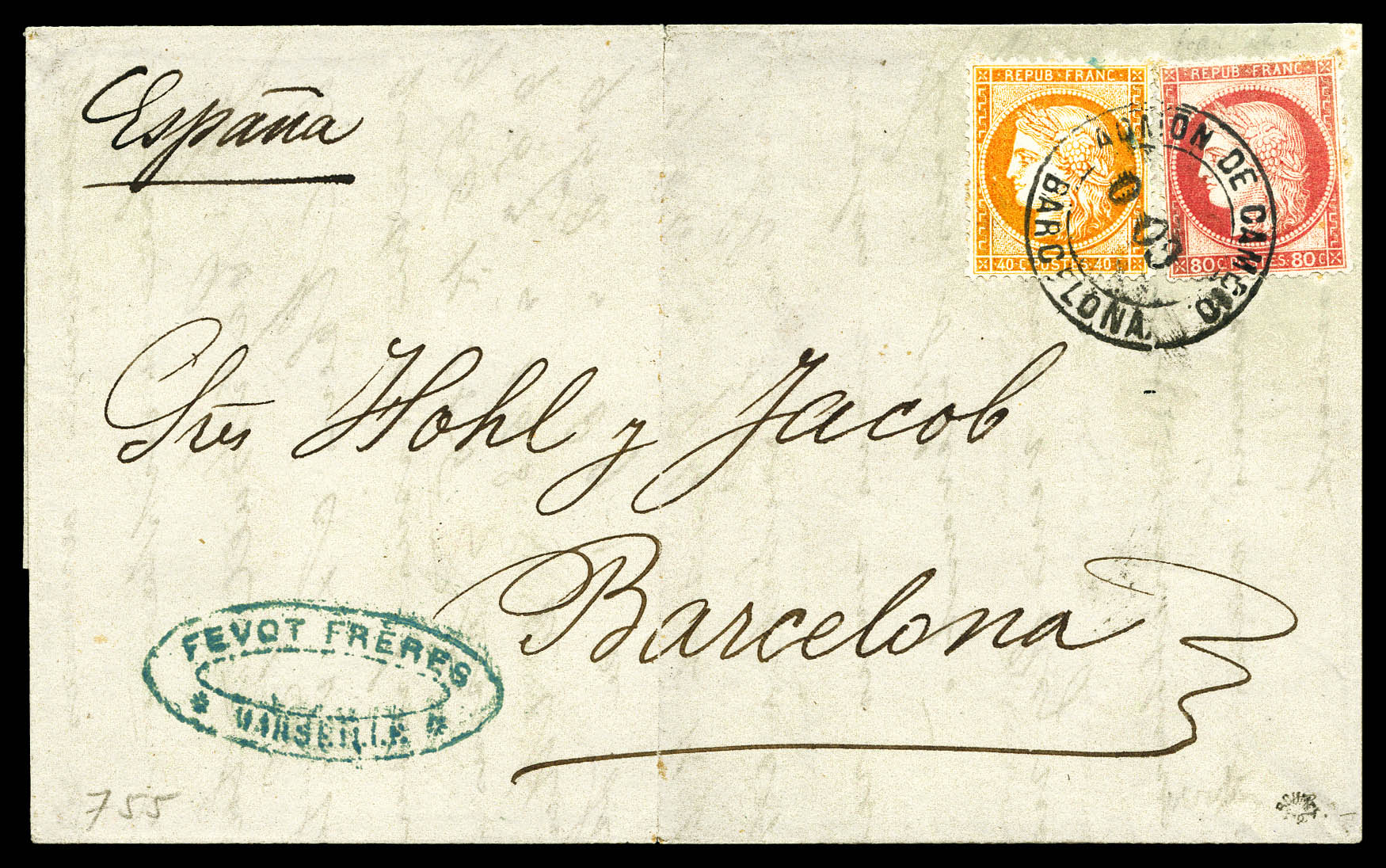 1876, 40c Siège (n°38) + 80c Cérès (n°57) obl Cachet ADMON DE CAMBIO/ 009/ BARCELONA' sur lettre de Marseille (ex Vente Thiaude 1977, lot 755). SUP (certificat) Qualité: Oblitéré (Image) (imagea)