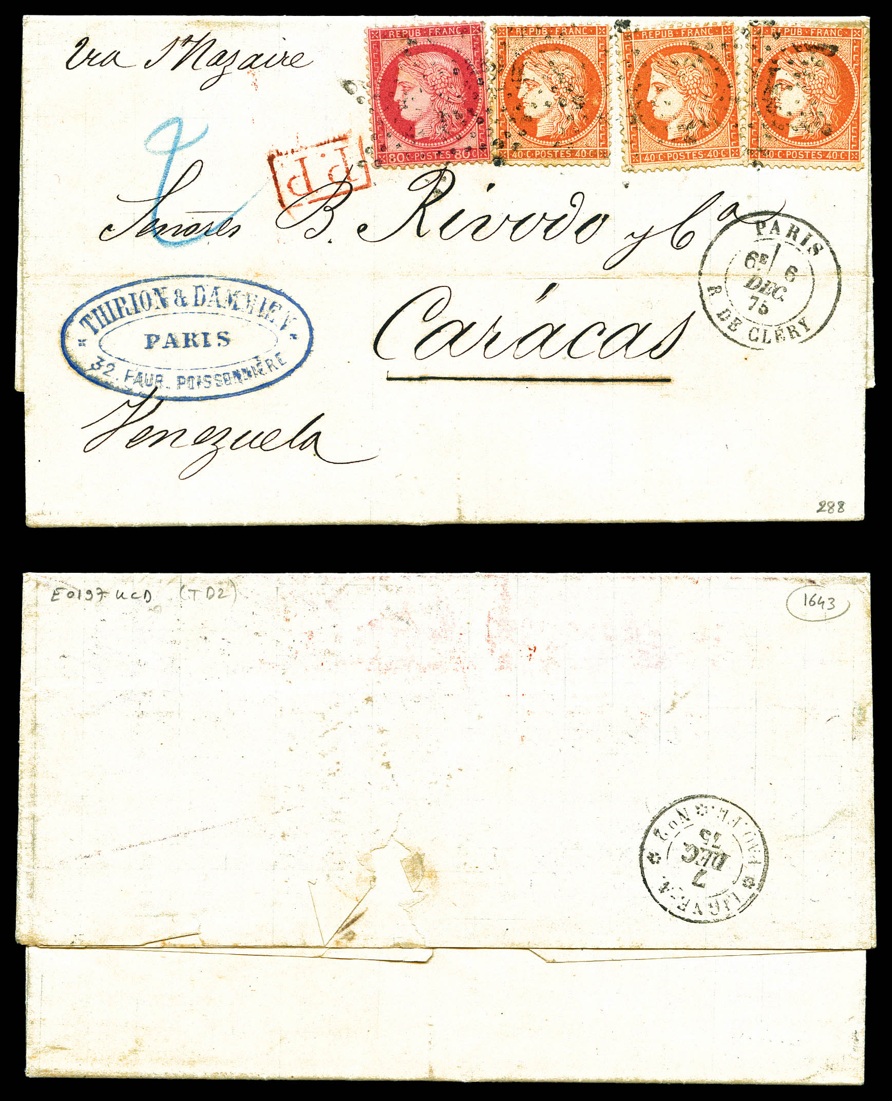 N°38 + 57, 40c Siège x 3 exemplaires +80c Cérès obl étoile 24 + Càd Paris rue de Clery le 6 dec 1875 sur lettre en double port pour le Vénézuela. TB (certificat) Qualité: Oblitéré (Image)