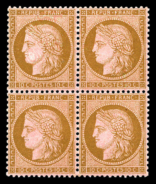 N°58, 10c brun sur rose en bloc de quatre, très bon centrage, fraîcheur postale. SUP (certificat) Qualité: **