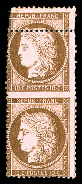 N°58, 10c brun sur rose: piquage decalé tenant à dentelé sur 3 cotés en paire verticale, R.R.R. et SUPERBE (signé Brun/certificat) Qualité: * (Image)