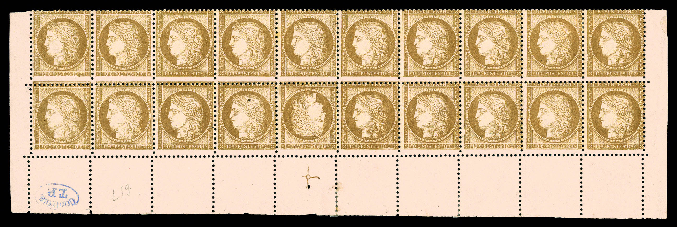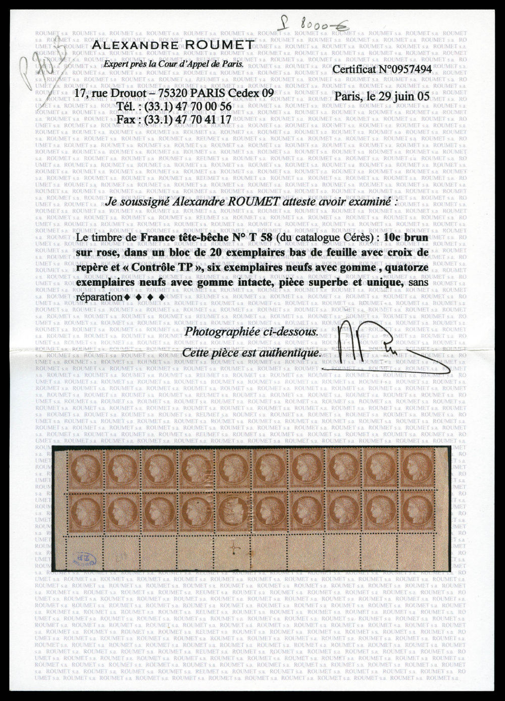 N°58c, 10c brun sur rose: tête-bêche tenant à normaux en bloc de 20 exemplaires bas de feuille avec croix de repère et 'contrôle TP' en bleu (6 exemplaires normaux *). PIECE SUPERBE ET UNIQUE. R.R.R.