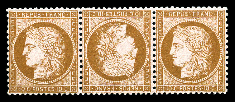 N°58c, 10c brun sur rose. Tête-bêche au centre d'une bande de trois, très bon centrage, fraîcheur postale. SUPERBE. R.R. (signé/certificat) Qualité: ** (Image)