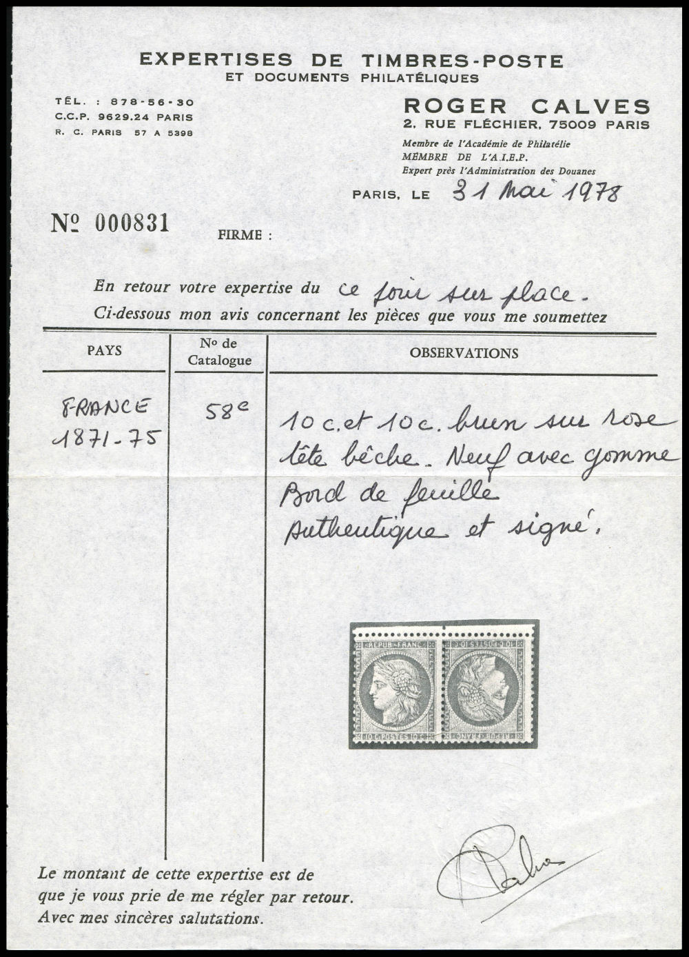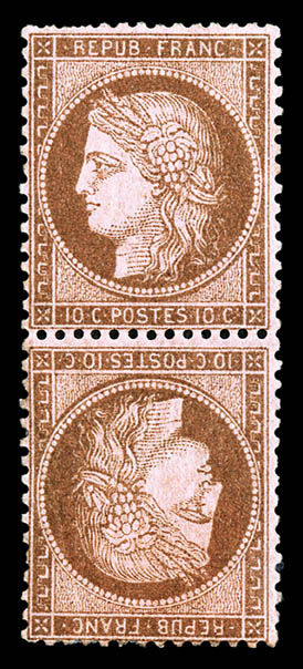 N°58c, 10c brun sur rose en paire tête-bêche verticale, deux dents courtes, très frais, rare (signé Calves/certificats) Qualité: * Cote: 8000 euros (Image)