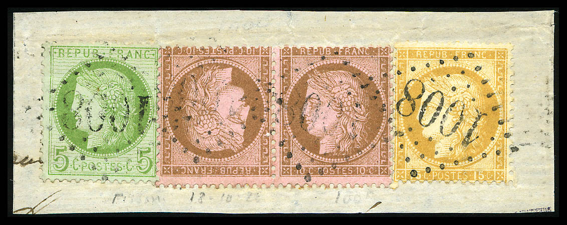 N°58c, 10c brun sur rose en paire tête-bêche sur fragment +N°53 et 55, jolie pièce, SUP (certificat) Qualité: Oblitéré Cote: 2750 euros (Image)