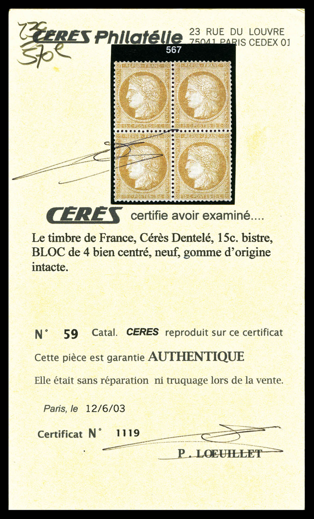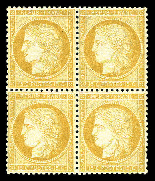 N°59, 15c bistre en bloc de quatre, centrage parfait. SUP (signé Calves/certificat) Qualité: **
