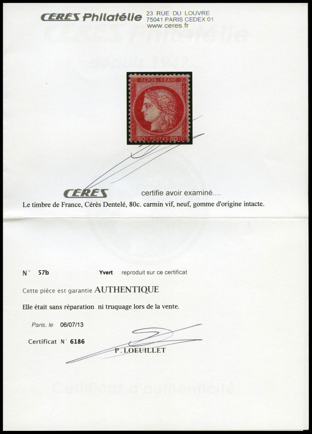 N°57a, 80c carmin-rose, frais. TTB (certificat) Qualité: * Cote: 1400 euros (Image) (imagea)