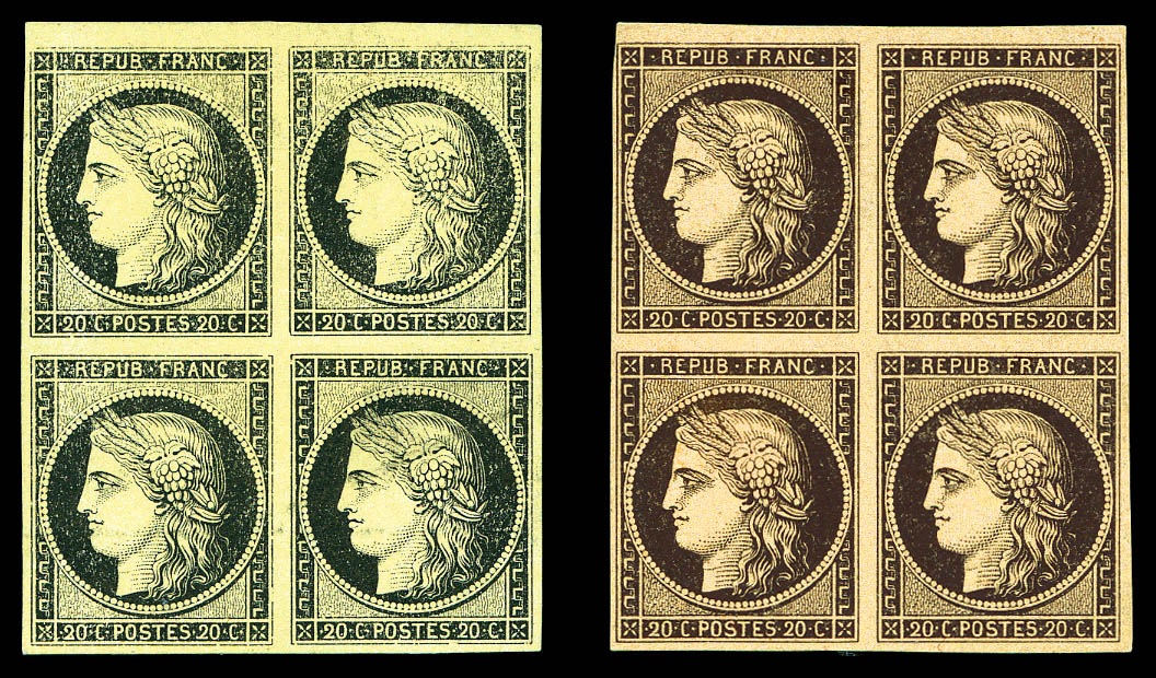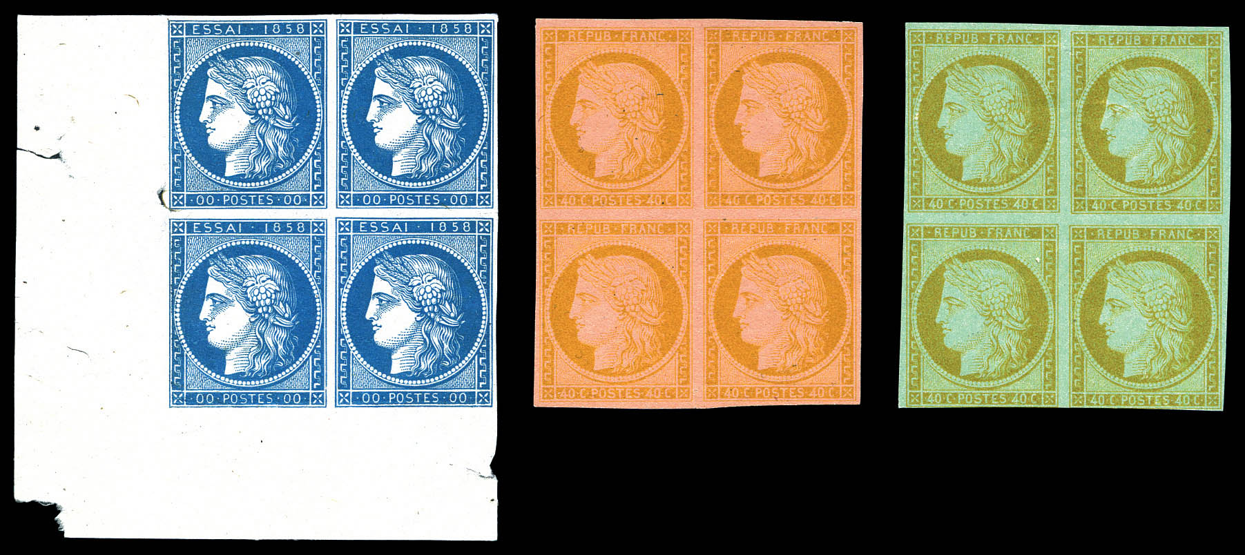 1000 ng image40c Cérès, 3 blocs de quatre: 40c brun-clair sur rose, 40c bistre orangé sur bleuté et essai 1858 en bleu cdf. TTB (certificat) Qualité: (*) Cote: 1240 euros (Image)
