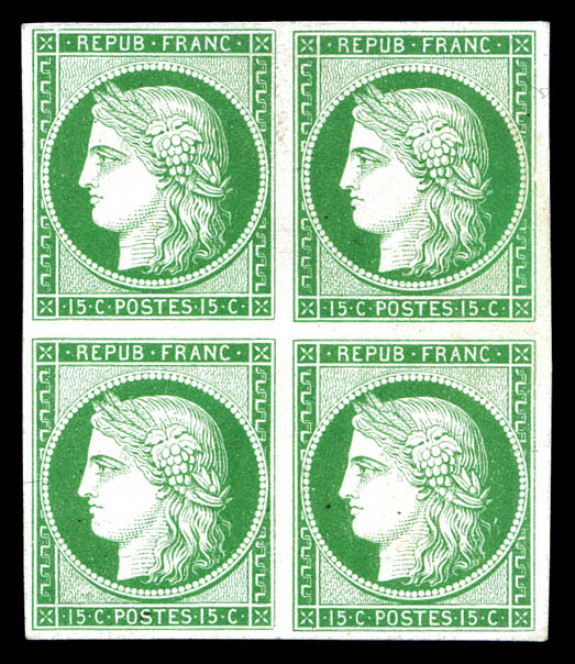 997 ng imageN°2, Cérès 1849, 15c vert sur papier carton en bloc de quatre. SUP. R. (certificat) Qualité: (*) Cote: 1600 euros (Image)