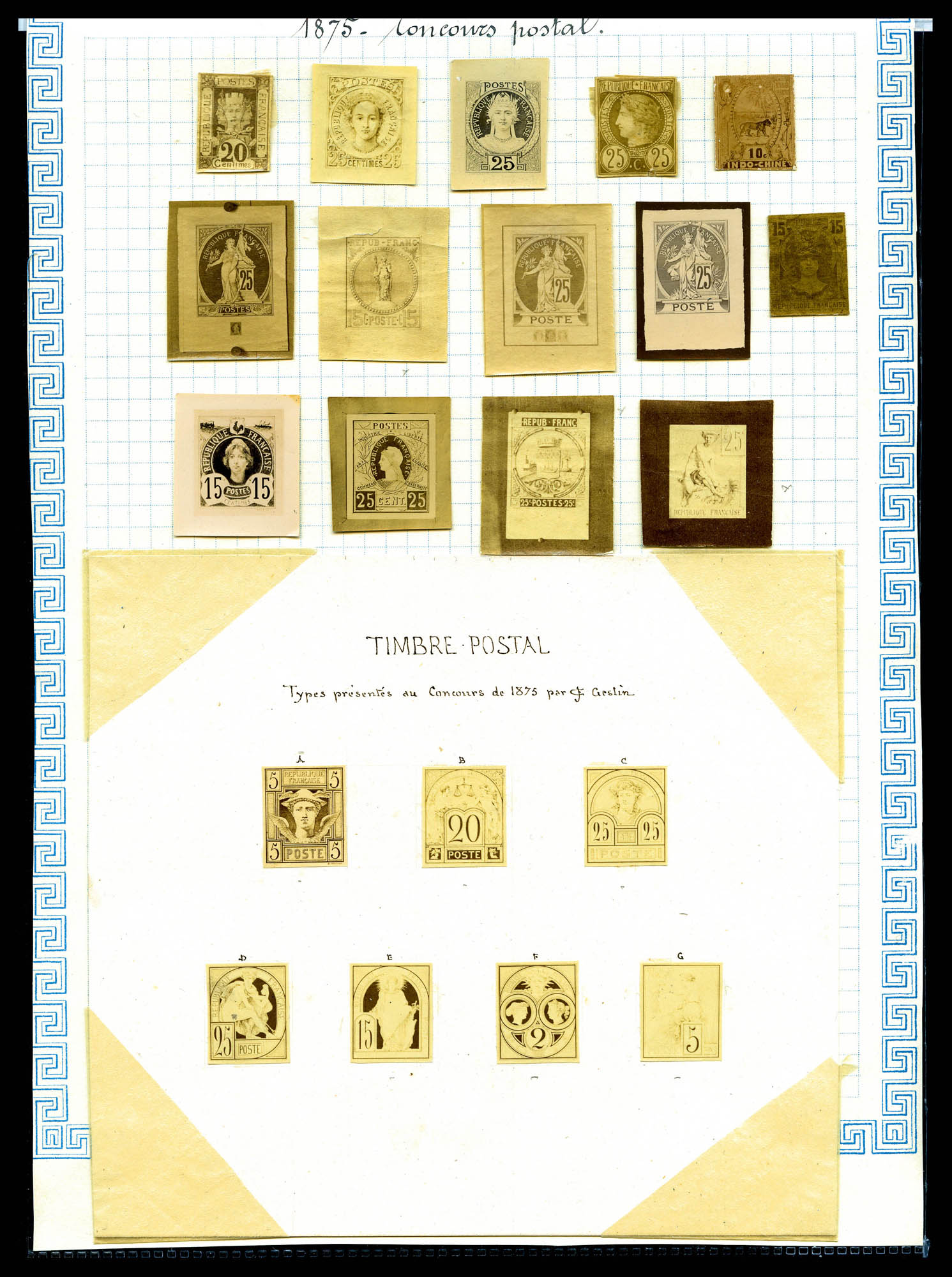 1044 ng imageNon émis. Concours 1875 pour le remplacement du Cérès 1871. Nombreux artistes représentés, 14 photos d'atelier et 7 collées sur carton de 'F. Geslin' (représentés dans le Maury 1907 p.350/351). Probablement unique. SUP (certificat) Qualité: (*) (Image)