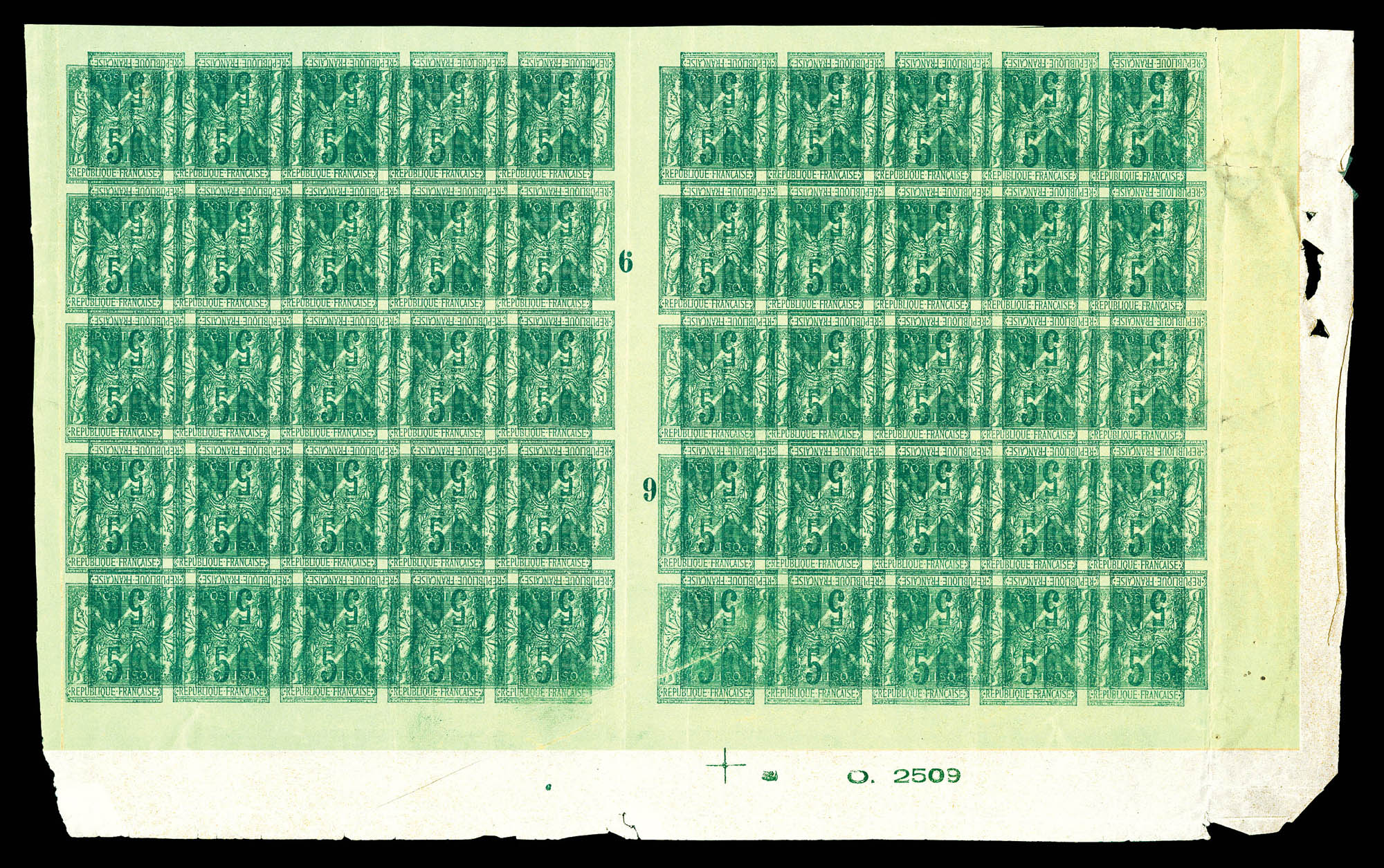 1045 ng imageSage 5c vert type II. Feuilles de passe. Double impression dont une renversée, panneau de 50 ex mill. 6, encadré, bas de feuille avec croix de repère et numéro. TB (certificat) Qualité: (*) (Image)