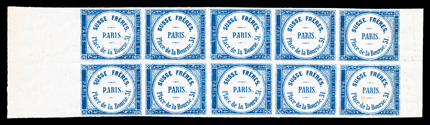 1050 nh imageBloc de 10 vignettes non dentelés 'SUSSE FRERES', bord de feuille avec circulaire du 10 janvier 1861, très jolie pièce, R.R.R. (certificat) Qualité: ** (Image)