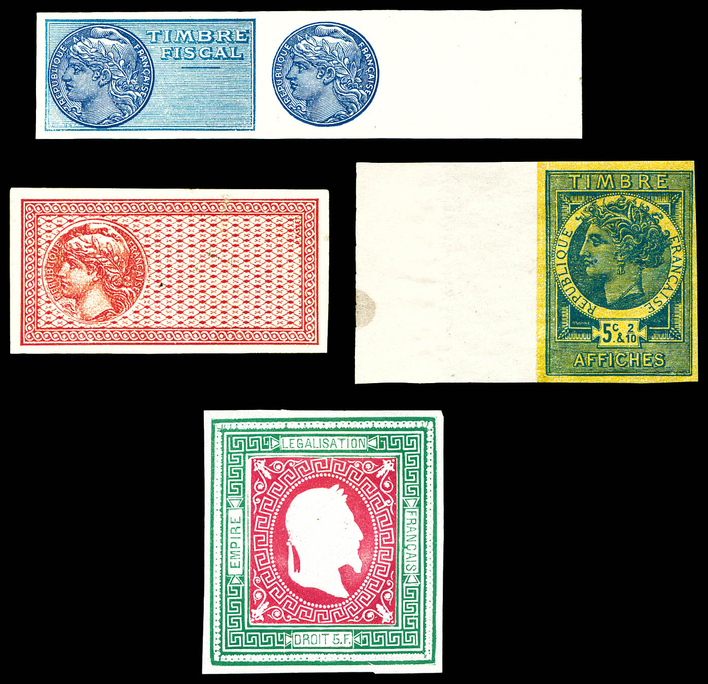 1055 N image1870-1925, 4 essais divers dont Légalisation (*), Affiches et Tasset (2). TB Qualité: N (Image)