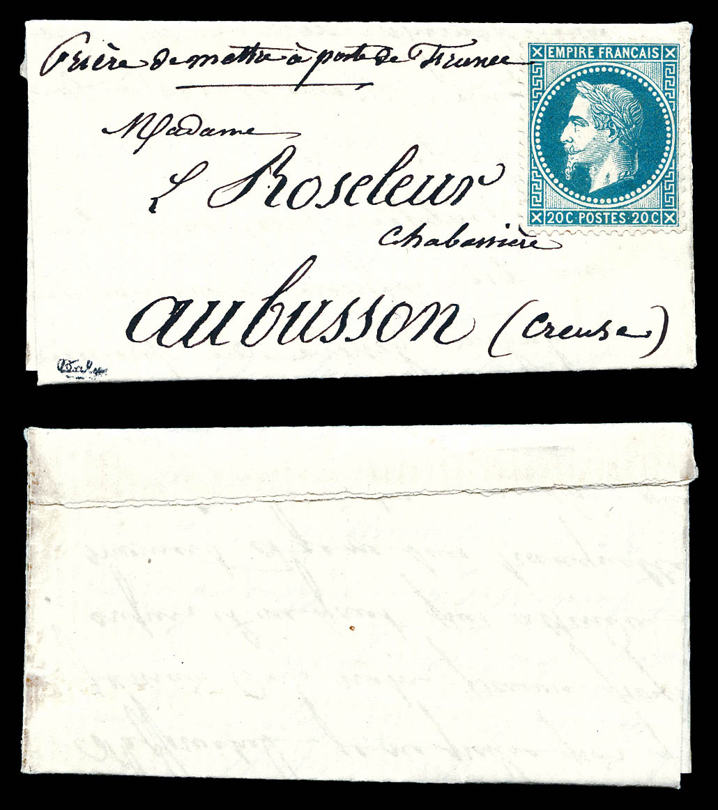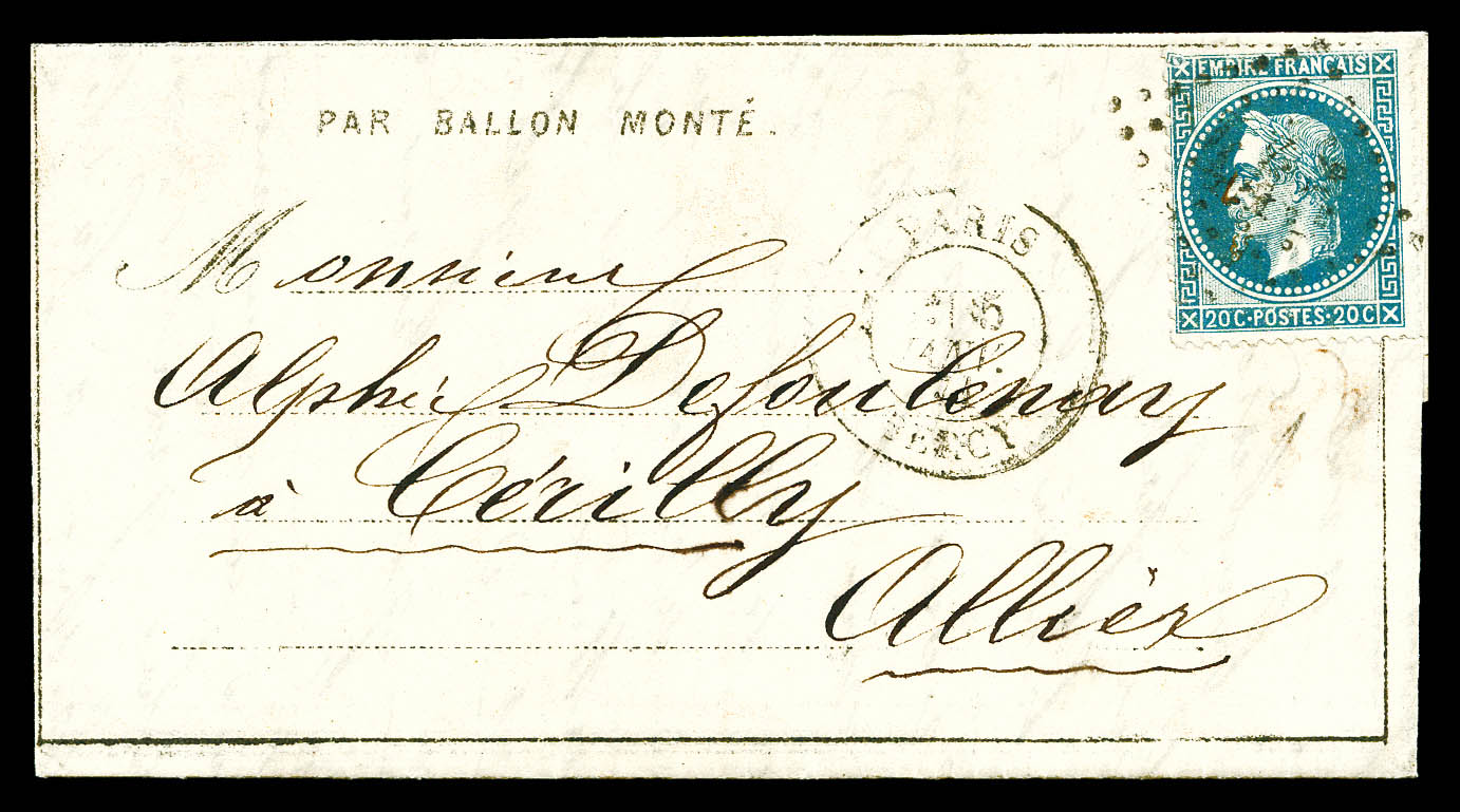 1060 imageLE DUQUESNE, 20c Lauré obl GC 445 + càd Paris/Bercy du 5 janv 70 sur journal le Dépêche-Ballon n°20 pour CERILLY, au verso arrivée le 19 janv 71. SUP (certificat) Qualité: Oblitéré (Image)