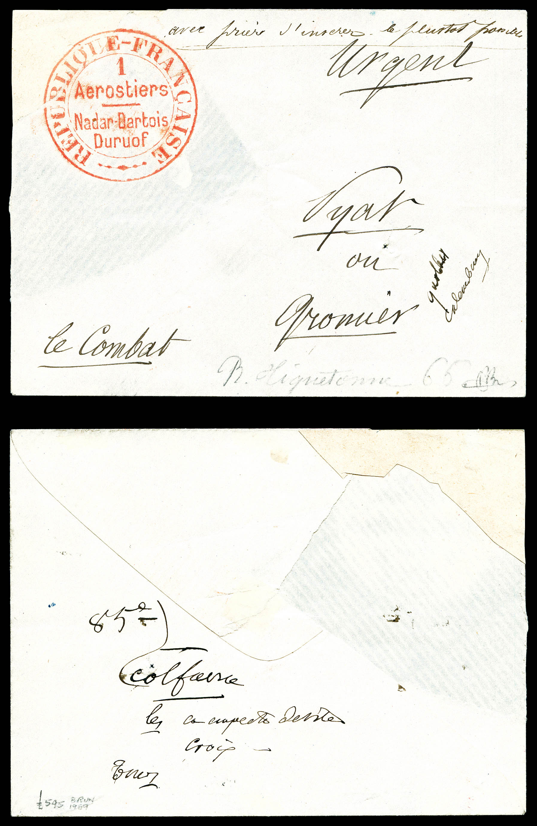 1058 imageGrand cachet rouge des Aérostiers 'NADAR DARTOIS DURUOF' au recto d'une enveloppe (angle supérieur refait pour présentation) adressée au journal Le combat avec mention manuscrite 'Prière d'inserer le plutôt possible - Urgent'. Pli porté. R.R.R. (signé Brun/certificat) Qualité: Oblitéré (Image)