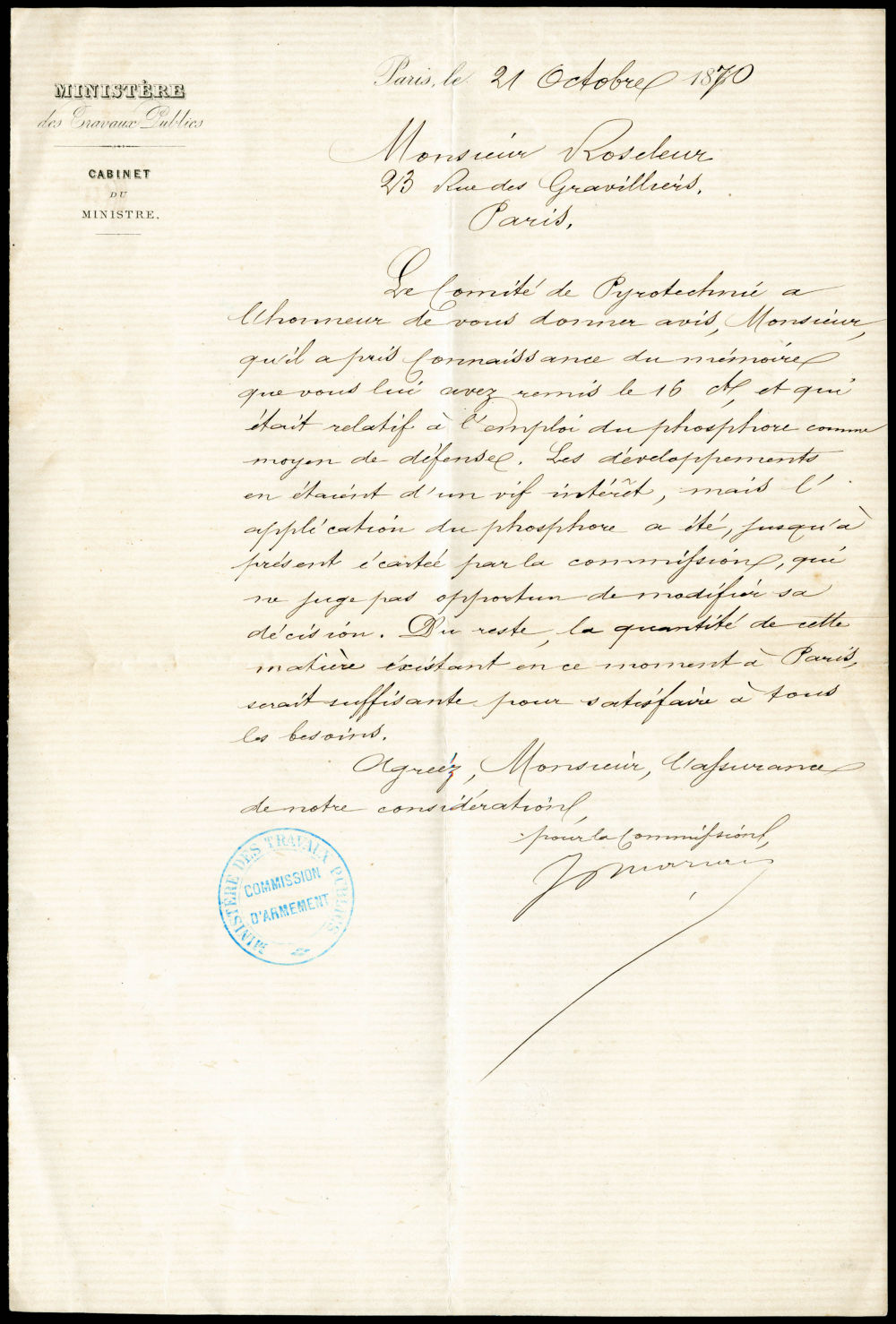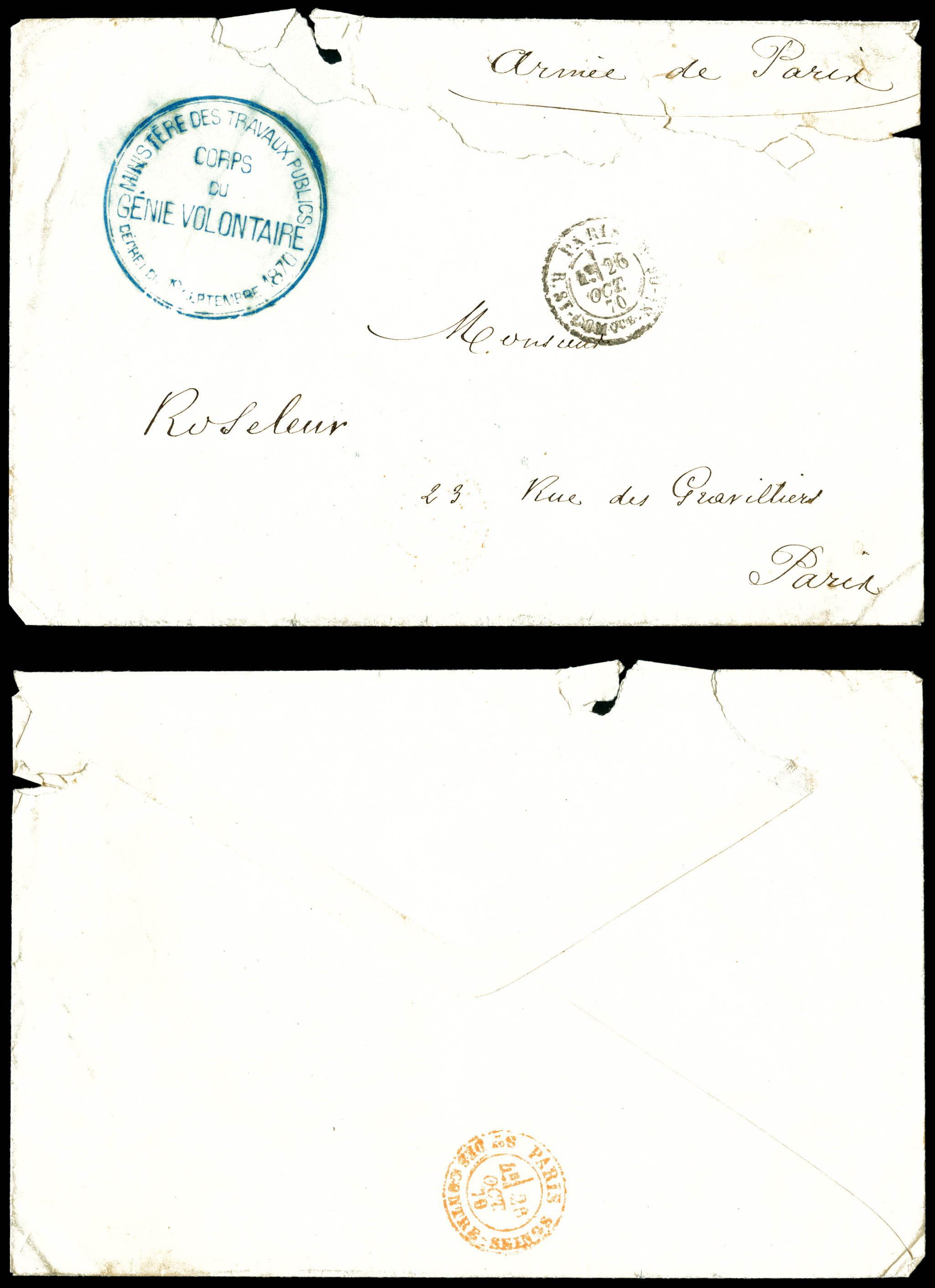 1059 imageBALLON DES GRAVILLIERS: Ensemble comprenant: A/ une lettre à en-tête de ses activités professionelles (Hydroplastie, Photographie et galvanoplastie) adressées au comité de Pyrotechnie datées du 16 oct 1870. Texte relatif en particuier à l'utilisation au phosphore dans l'armement. B/Joint en réponse, lettre à en tête au Ministère des Travaux Publics, datées au 21 octobre 1870 avec enveloppe avec càd Paris (60) 26 oct 70 et grand cachet bleu du Ministère des Travaux Publics-Corps du Génie Volontaire. C/ lettre manuscrite signée Alfred ROSELEUR sur son papier à entête illustré portant indication de ses activités professionnelles datée Paris 18 octobre 1870 adressée à sa femme Léonie à Aubusson. Lettre relative à ses tentatives de correspondances par ballonnets et ballons montés. 2 pages in quarto. Lettre d'un très grand interêt concernant l'histoire des ballons des Gravilliers. SUPERBE. R.R.R. (certificat) Qualité: Oblitéré (Image) (imagea) (All Images)