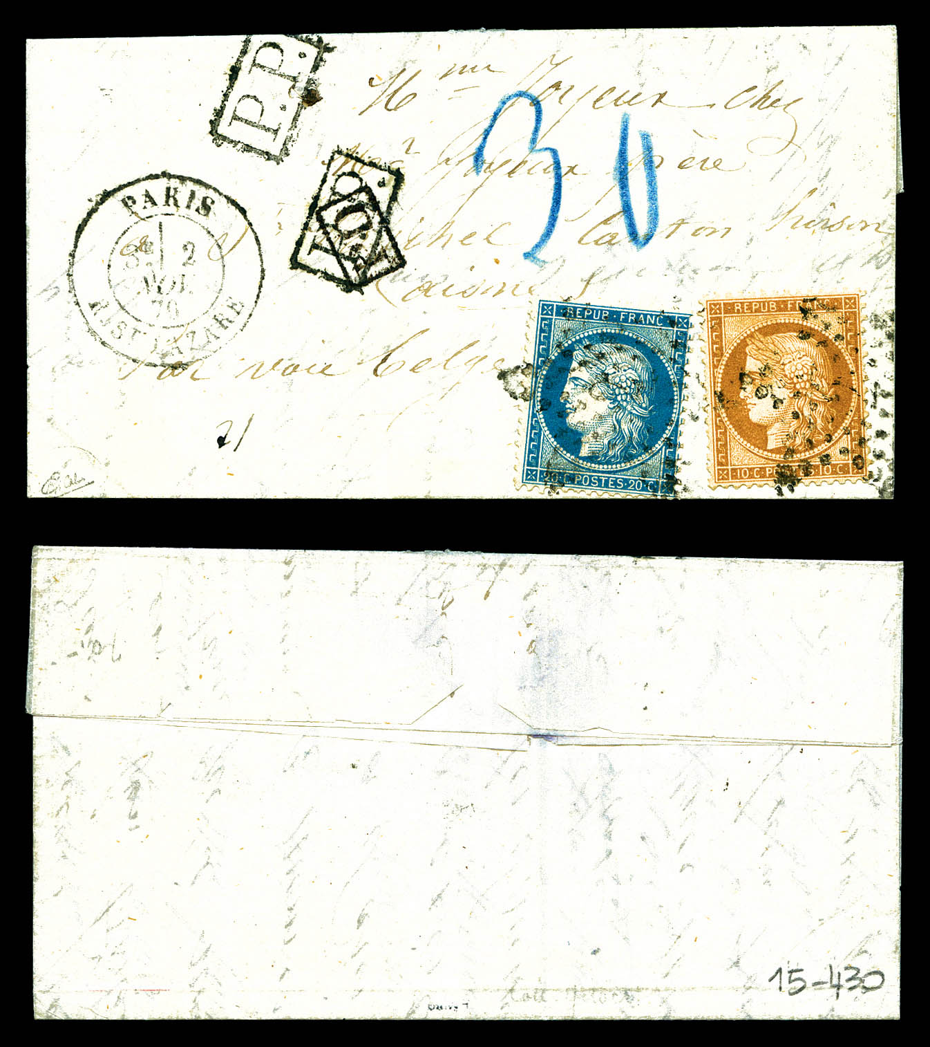 10c et 20c Siège obl étoile 2 Paris à destination de HIRSON en zone occupée avec mention manuscrite 'par voie Belge' avec 2 griffes