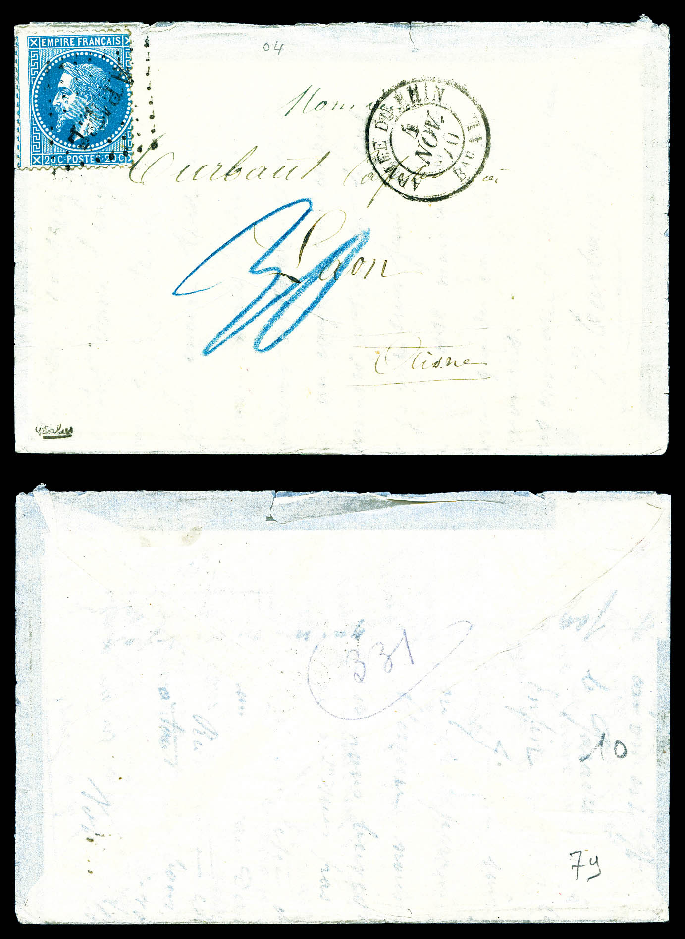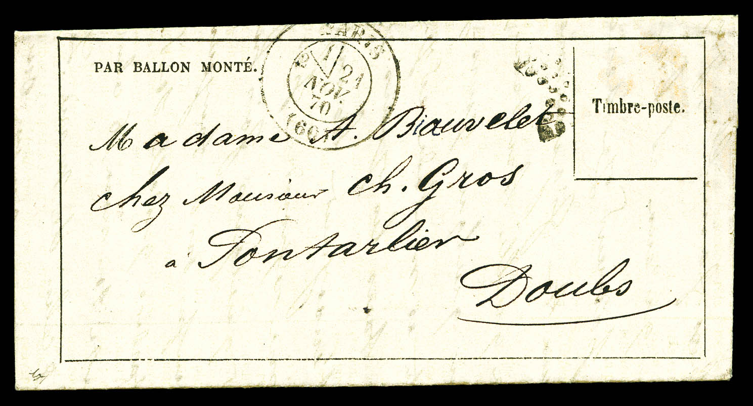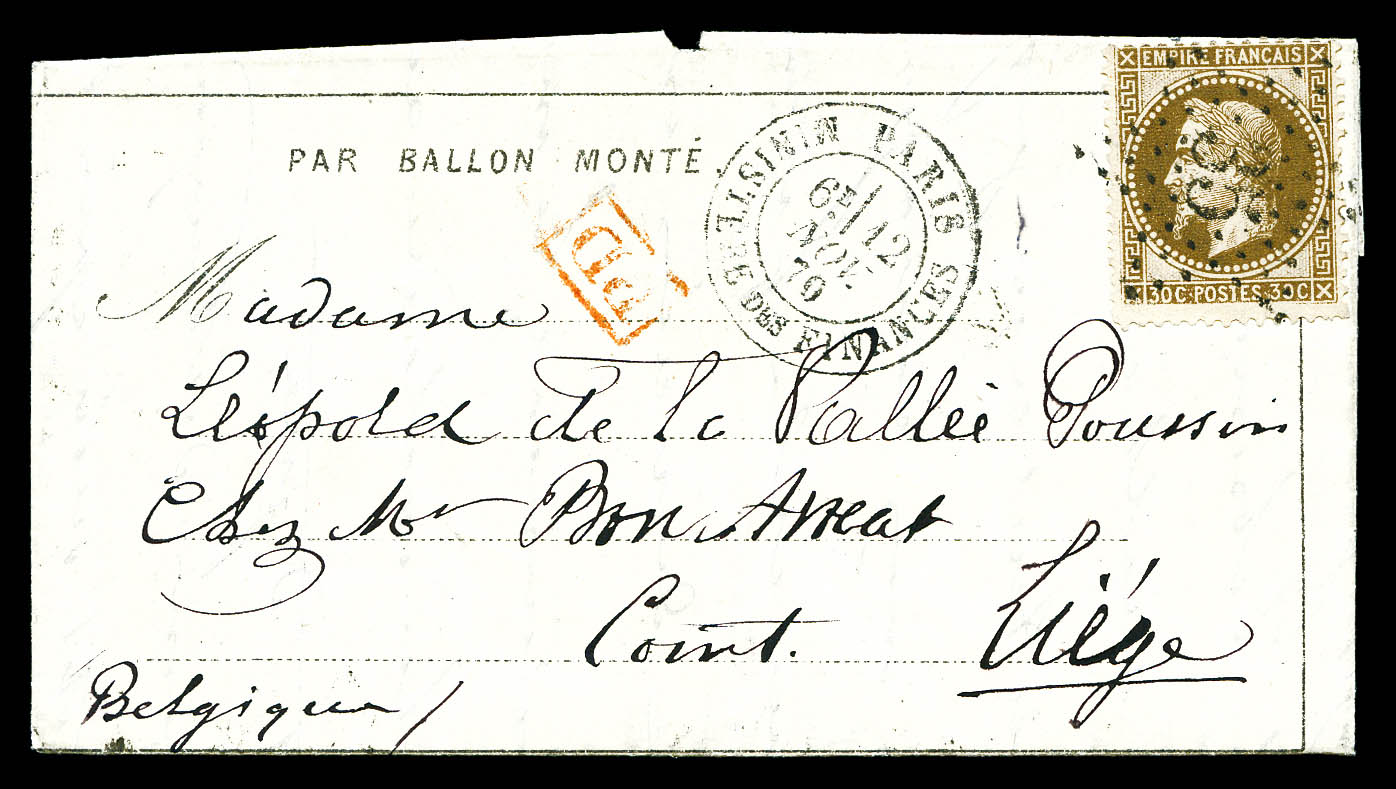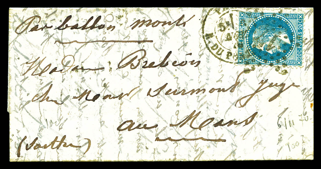 20c EMPIRE DENTELE obl étoile + Càd du 10 novembre 1870 sur Dépèche-Ballon n°4 à destination de St LAMBERT DES LEVEES. TTB