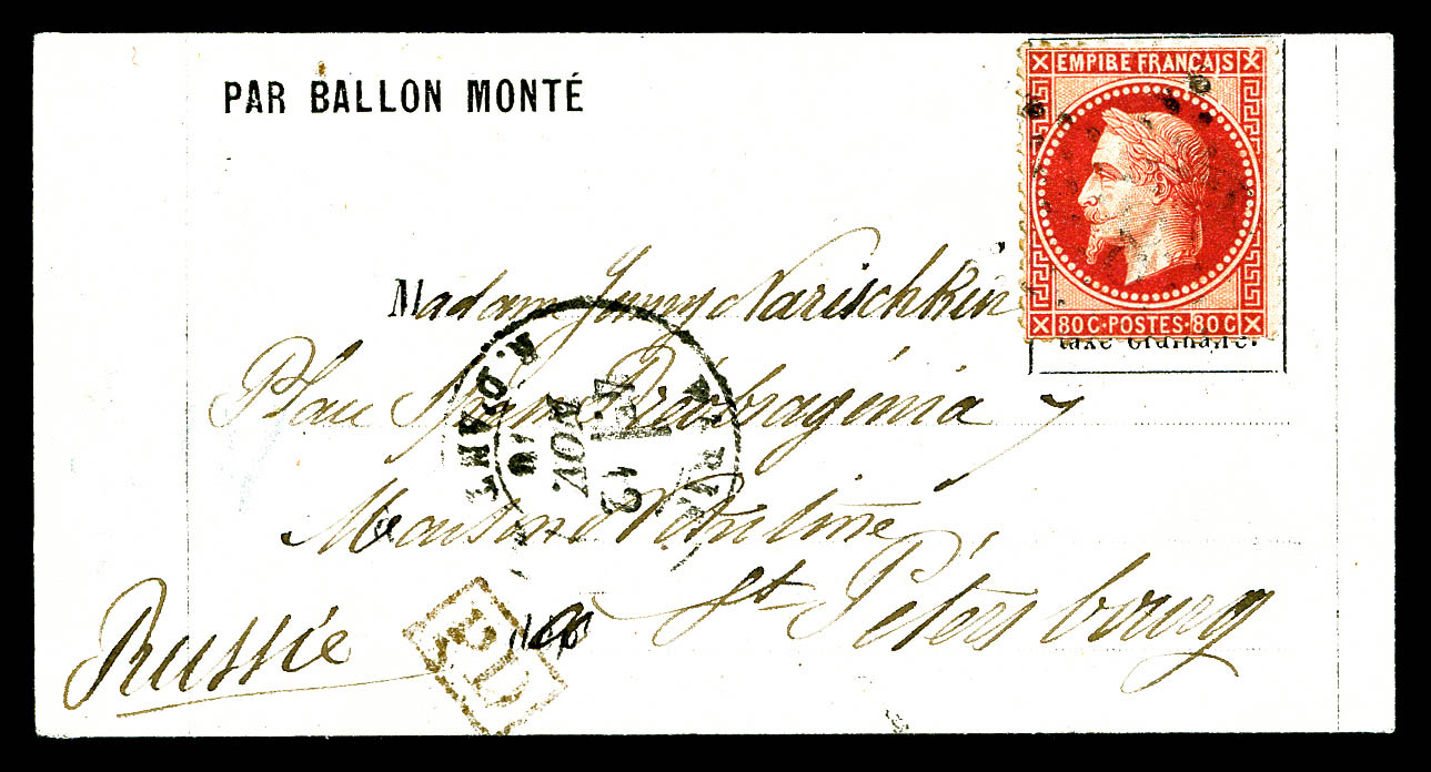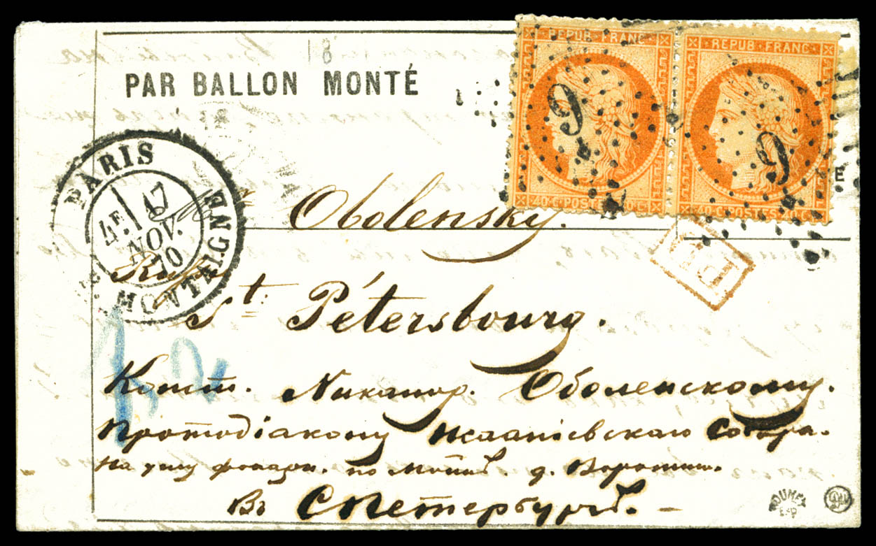 RUSSIE: 40c Siège en paire obl étoile '9' Paris Rue Montaigne sur lettre du 17 novembre 1870 avec mention imprimée 'PAR BALLON MONTE'