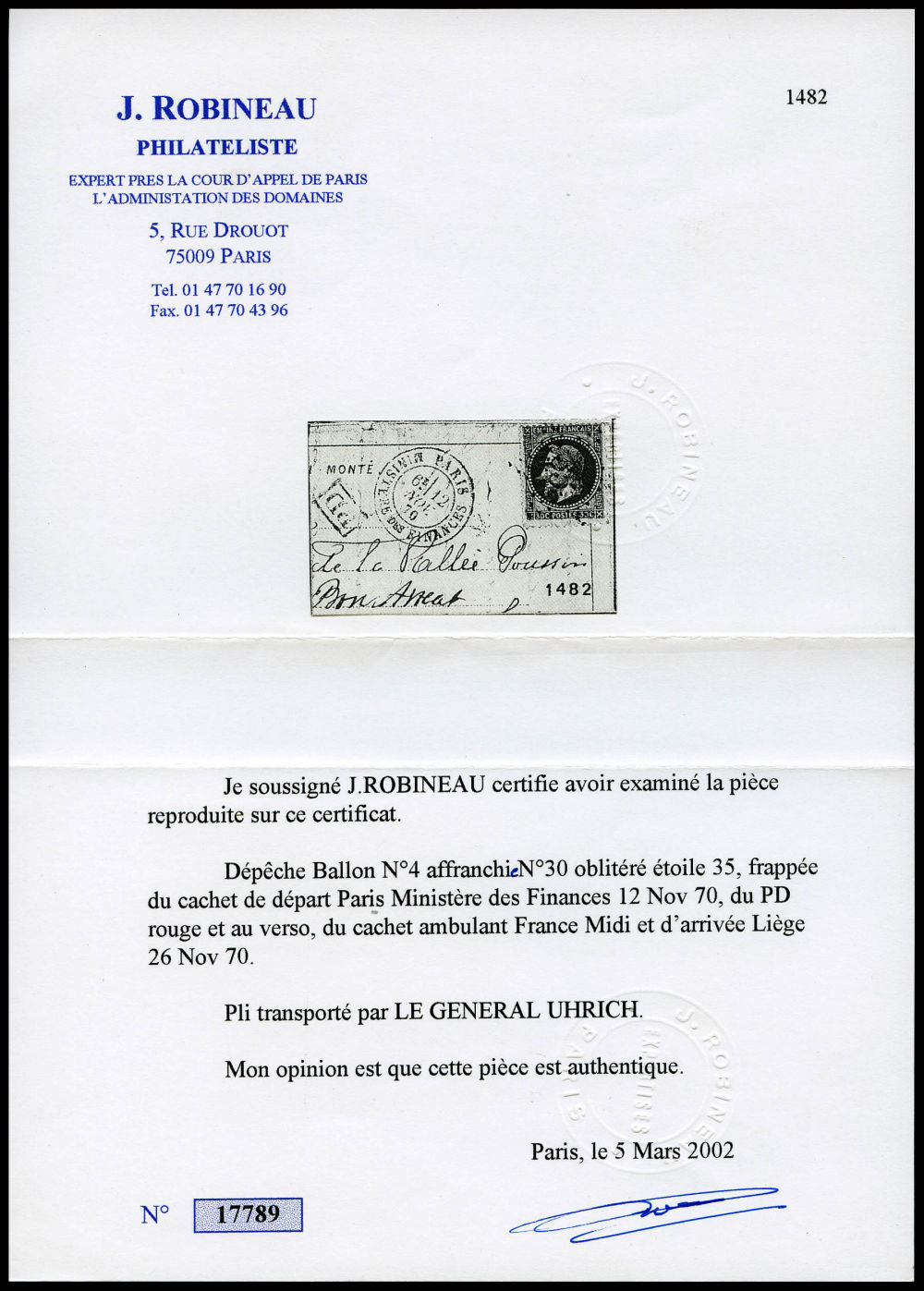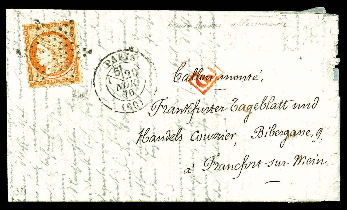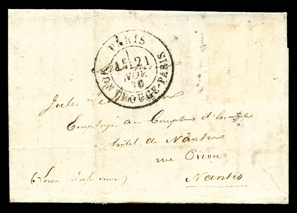 LE GENERAL UHRICH' (probable), 80c Lauré obl étoile 8 + càd Paris R. D'antin du 12 nov 1870 + griffe 'PD' en rouge sur lettre à