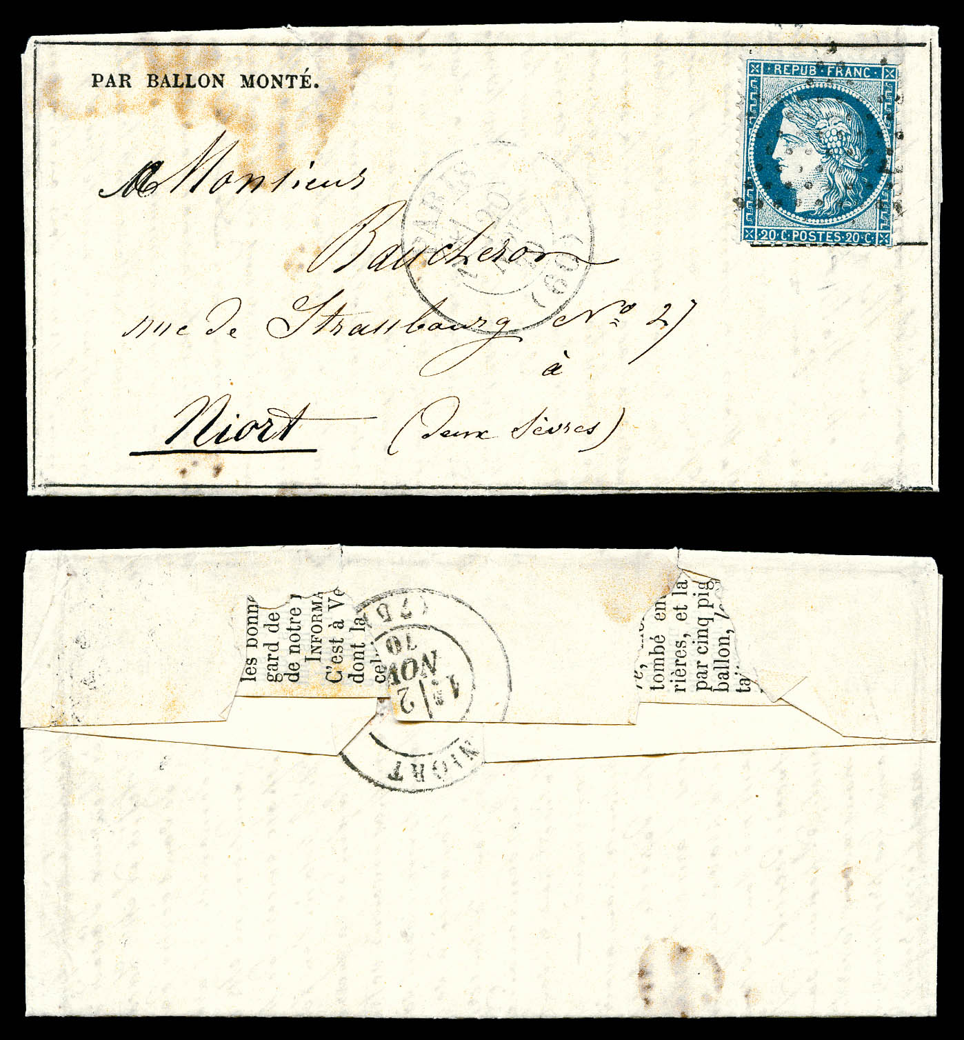 L'ARCHIMEDE', Gazette des Absents N°9, 20c Siège, cad du 20 nov 70 pour Niort. Cachet d'arrivée au verso, date incomplète. TB