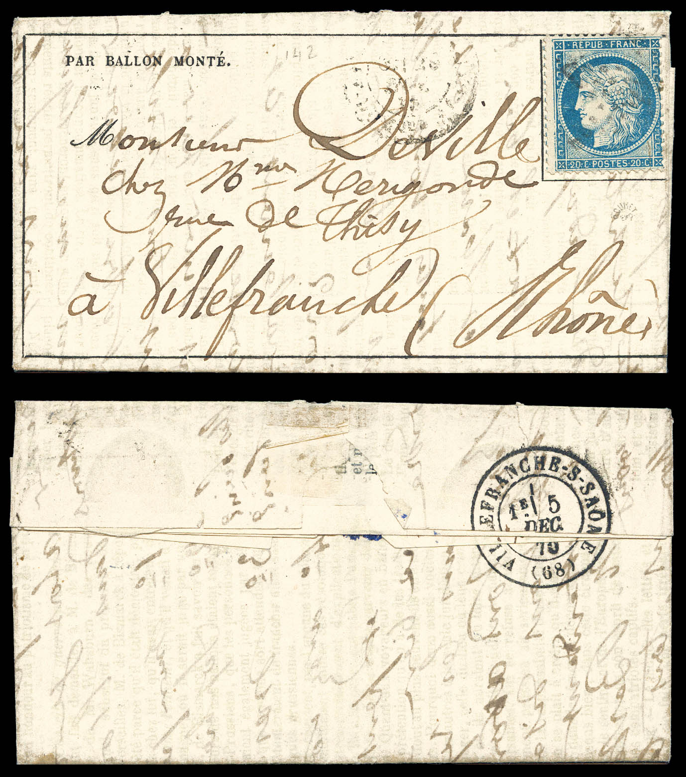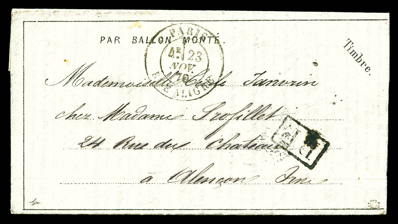 LE BALLON POSTE N°10' affranchi avec 40c Lauré et Siège 10c +20c oblitérés étoile '15' + càd 'Paris r.Bonaparte' du 5 dec 70 à