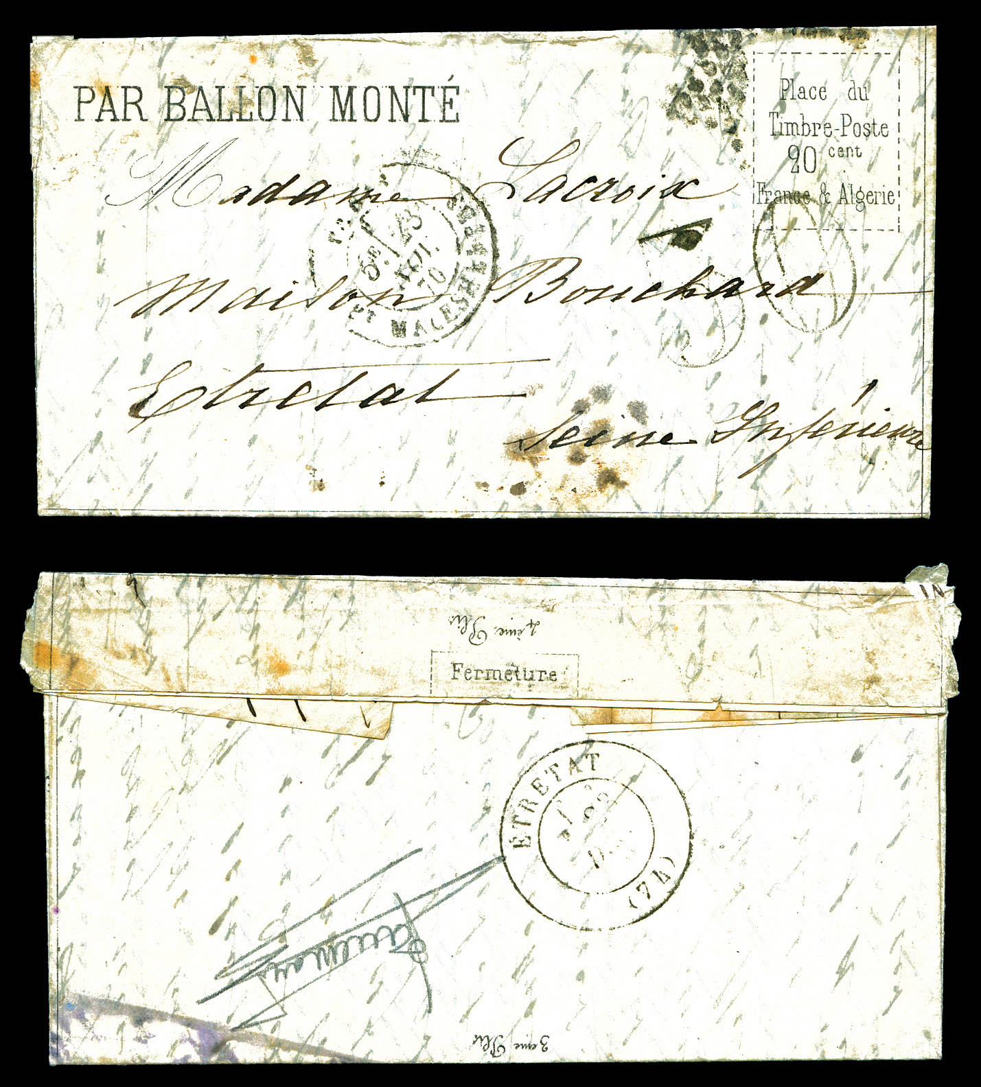 LA VILLE D'ORLEANS' (repêchage de Mandal), DEPECHE BALLON N°6, courrier accidenté avec timbre tombé par immersion, càd Paris Rue