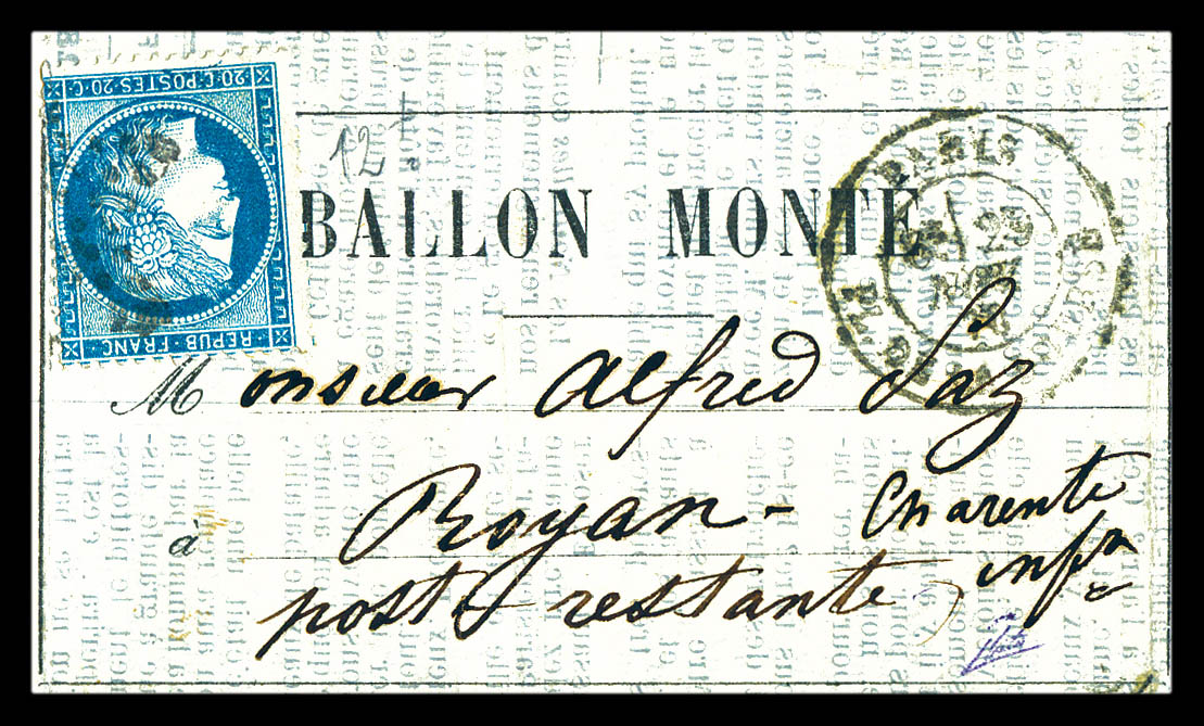 étoile 1 Paris PL de la Bourse le 29 novembre 1870 pour ROYAN. Quelques exemplaires connus. SUPERBE (certificat) Qualité: Oblitéré