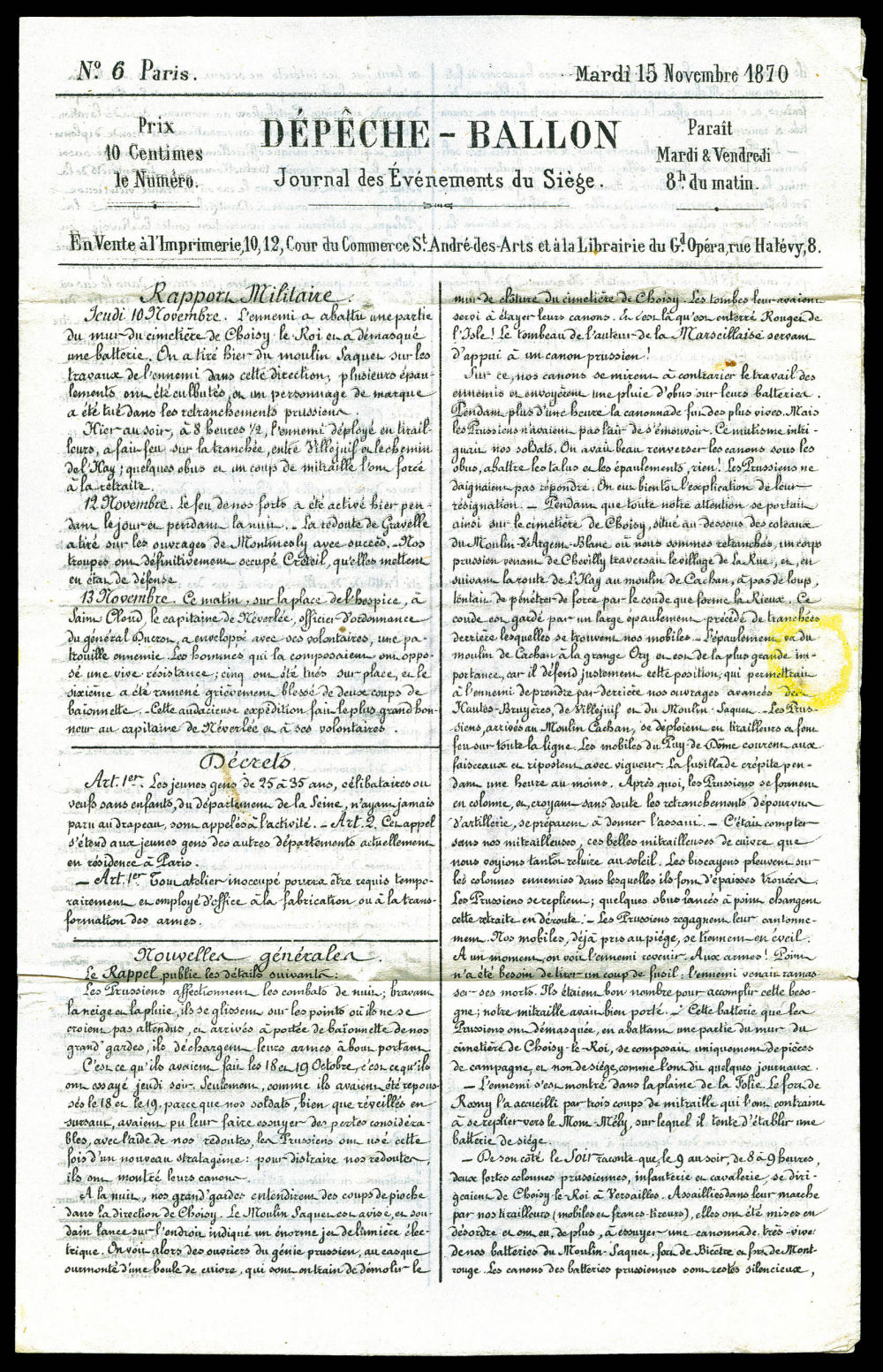 LE JACQUARD', Gazette des Absents N°11 affranchie avec 20c Siège, càd du 26 nov 70 pour Villefranche. Très bon texte sur les réponses