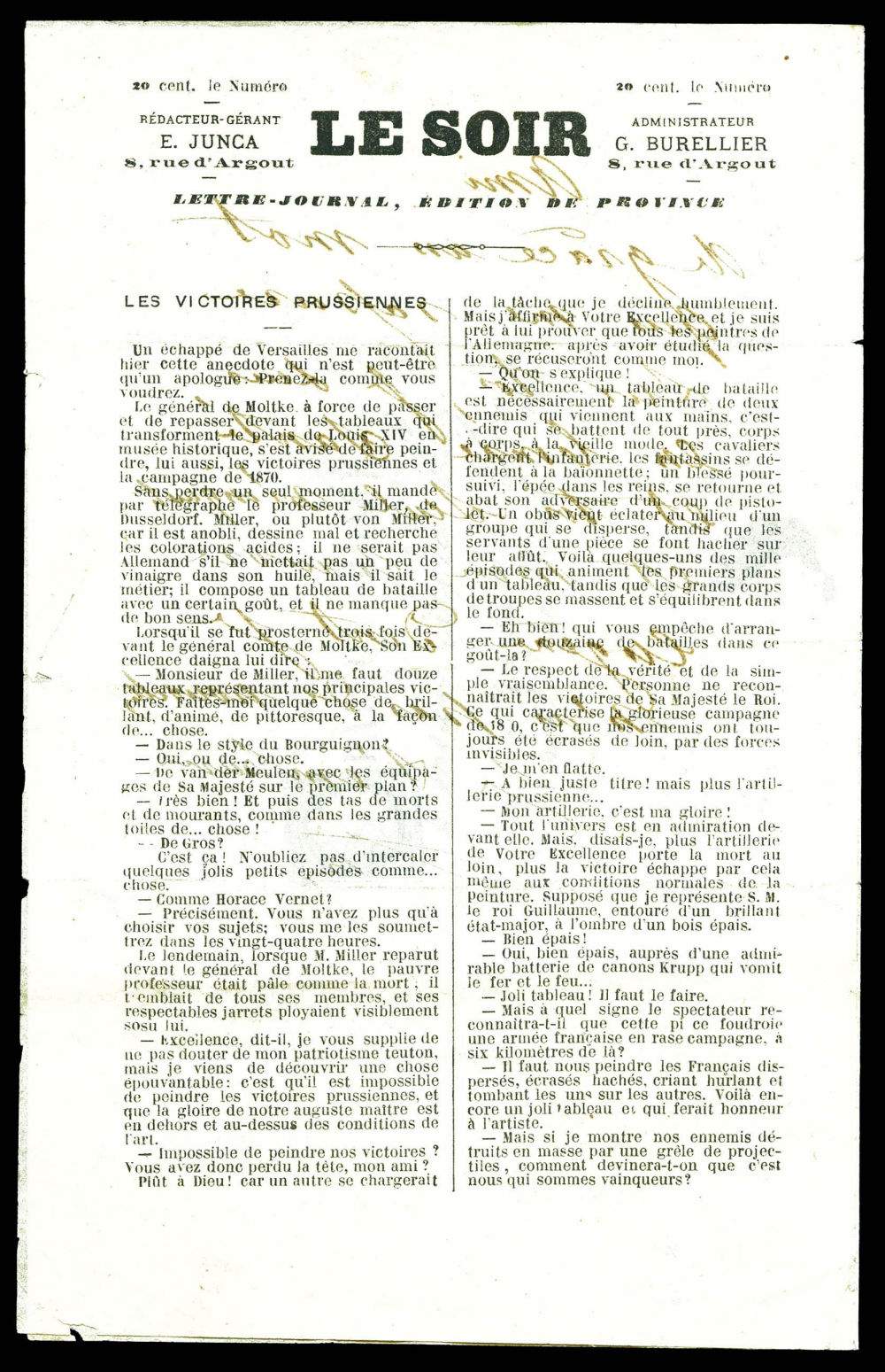 JOURNAL-LETTRE LE SOIR N°1 avec mention 'PAR BALLON MONTE' en grands caractères transporté par 'LE JULES FAVRE N°2': 20c Siège obl