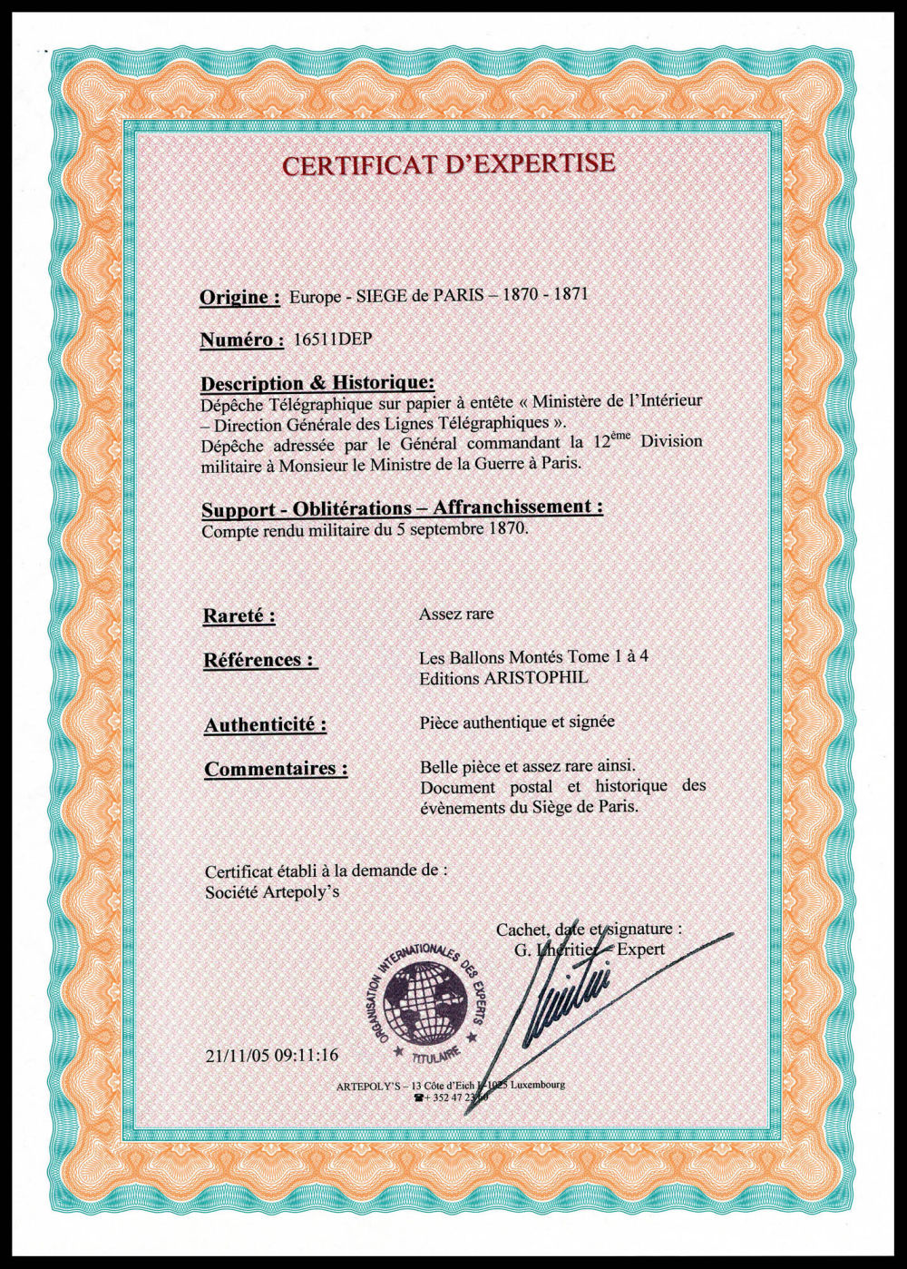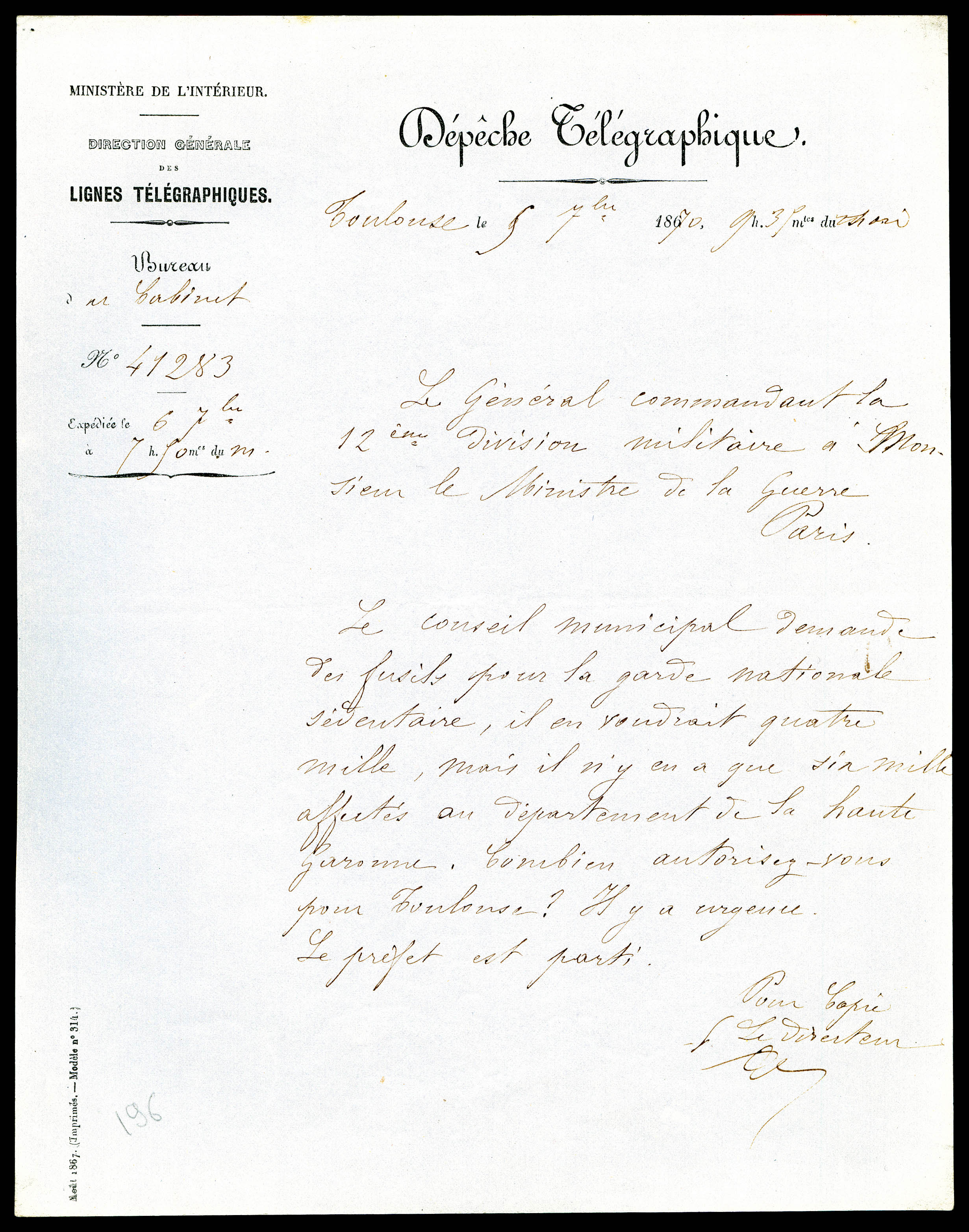 1121 imageDépêche télégraphique: papier à entête 'Ministère de l'Interieur-Direction Générale des Lignes Télégraphiques' adressée par le Général commandant la 12ème Division militaire à Monsieur le Ministre de la Guerre à Paris. TB (certificat) Qualité: Oblitéré (Image) (imagea) (All Images)