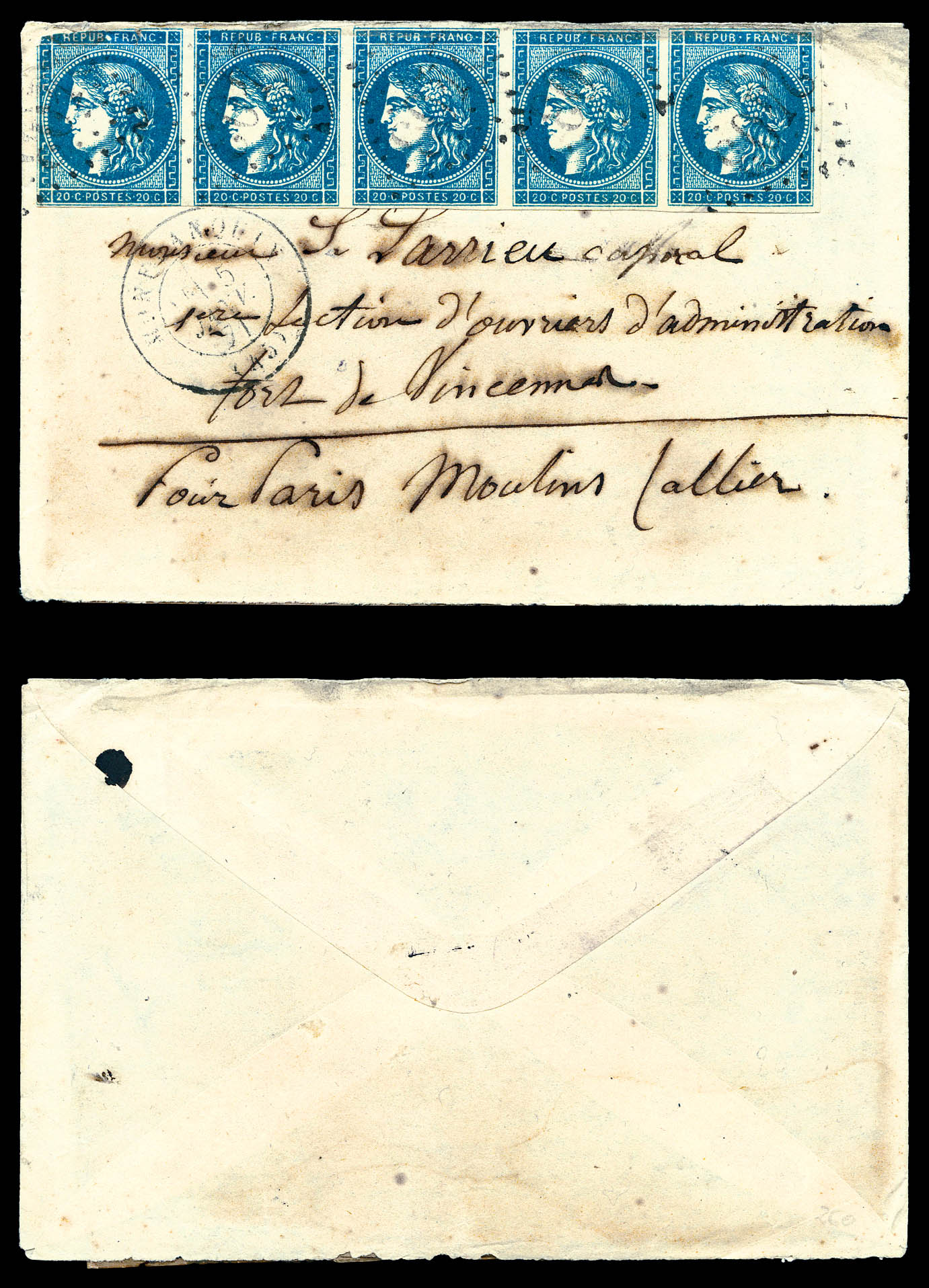 1126 imageEnveloppe + correspondance avec mention manuscrite 'PAR MOULINS (ALLIER)': affranchie avec bande de 5 exemplaires du 20c Bordeaux Type II obl GC 2403 + Càd de MONTFLANQUIN le 5 janvier 1871. SUPERBE. R.R. (certificat) Qualité: Oblitéré (Image)