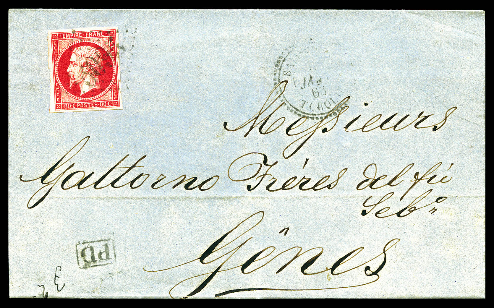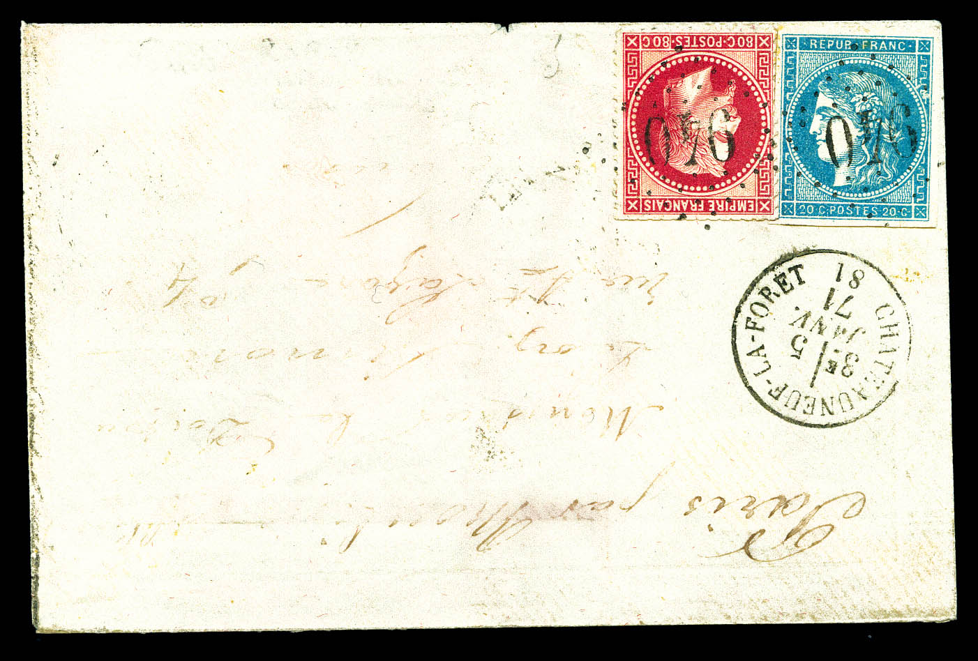 1123 image80c Non Lauré (N°24) et 20c Bordeaux type II (N°45) obl GC 3936 + càd de Thiers le 5 janvier 1871 sur enveloppe contenant une lettre manuscrite. Affranchissement complet très rare et probablement unique. SUPERBE. R.R.R. (certificat) Qualité: Oblitéré (Image)