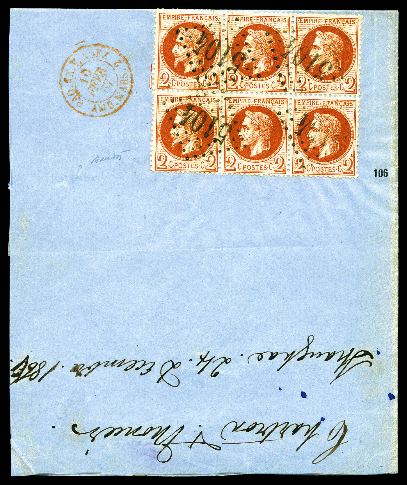 1135 image2c Empire Lauré en bloc de 6 oblitéré GC 5104 + càd rouge Paq. An. V. Suez/Amb. Mars 2, 1867 sur imprimé de Shangaî, Très rare affranchissement à 12c. SUP (certificat) Qualité: Oblitéré (Image)