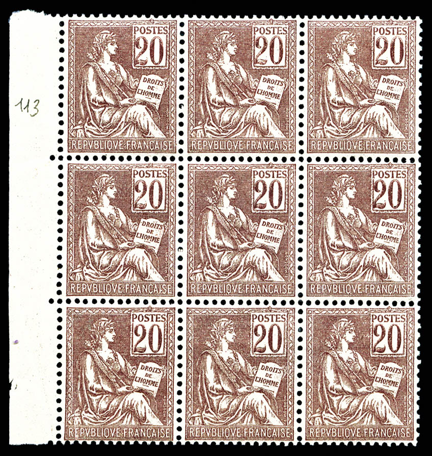 N°113, 20c brun-lilas, bloc de neuf bdf, très bon centrage, SUP (certificat) Qualité: ** Cote: 4050 euros (Image)