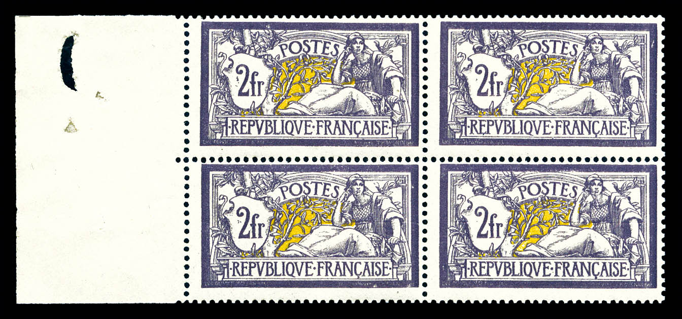 N°122, Merson, 2F violet et jaune en bloc de quatre bord de feuille latéral, grande fraîcheur, SUP (certificat) Qualité: ** Cote: