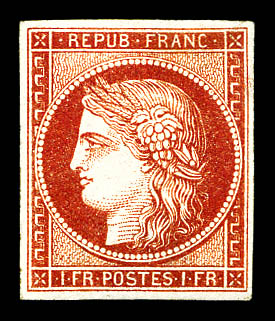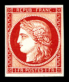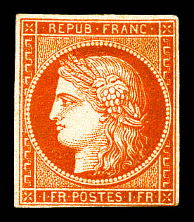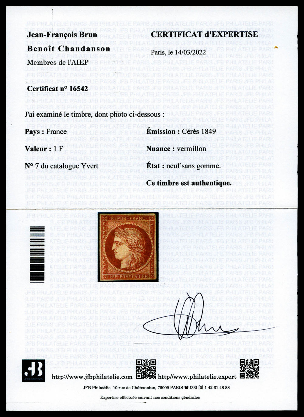 N°7, 1F vermillon, très belle nuance. SUPERBE. R.R.R. (signé Brun/certificat) Qualité: (*) Cote: 55000 euros