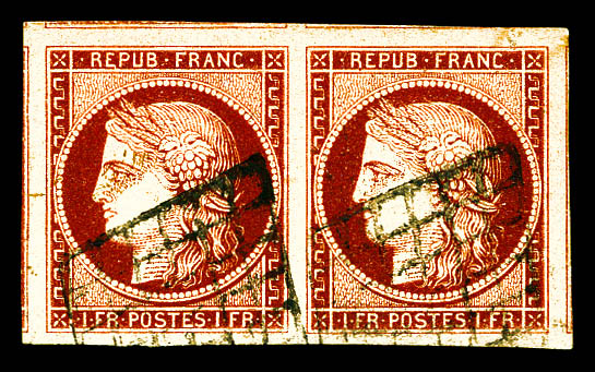 N°7a, 1F vermillon vif foncé tirage de Sedan, oblitéré grille, TRES BELLES MARGES AVEC VOISIN, SUPERBE. R.R.R (signé Calves/Brun/Margues/certificats) Qualité: Oblitéré (Image) (imagea)