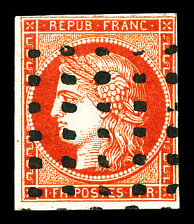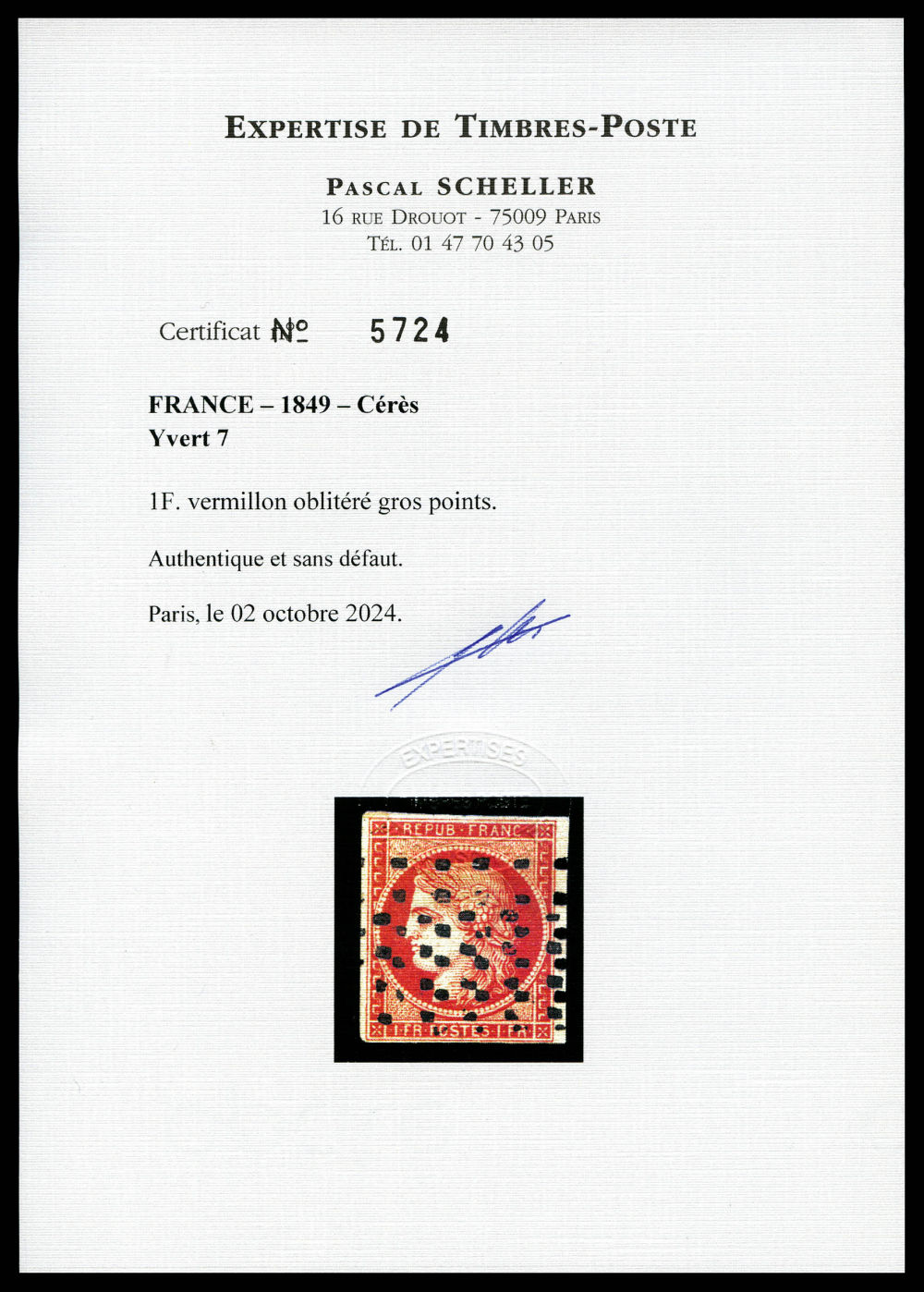 N°7, 1Fr vermillon obl gros points, très jolie pièce. SUP. R. (certificats) Qualité: Oblitéré Cote: 23000 euros