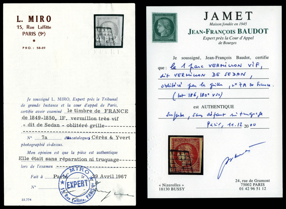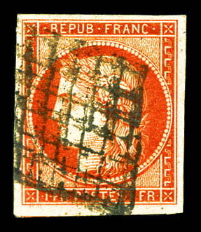 N°7a, 1F vermillon vif oblitération grille légère, filet latéral droit NE effleuré, très belle présentation. R.R. (signé Margues/certificats) Qualité: Oblitéré Cote: 27500 euros (Image)