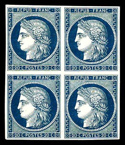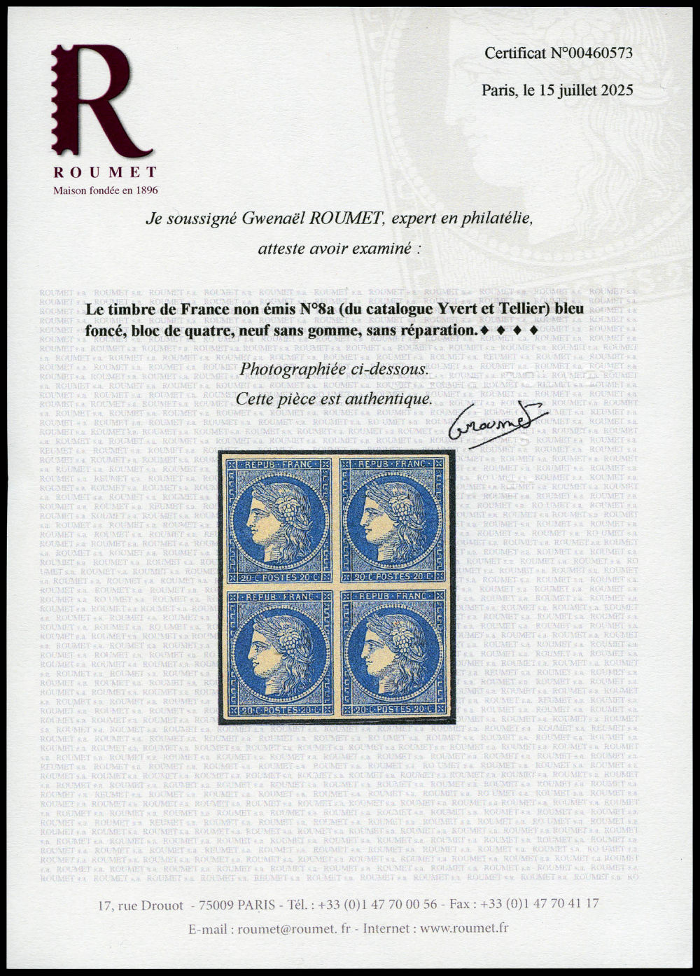 N°8a, Non émis, 20c bleu foncé en bloc de quatre. PIECE RARE et SUPERBE (signé Calves/certificats) Qualité: * Cote: 25000 euros (Image) (imagea)