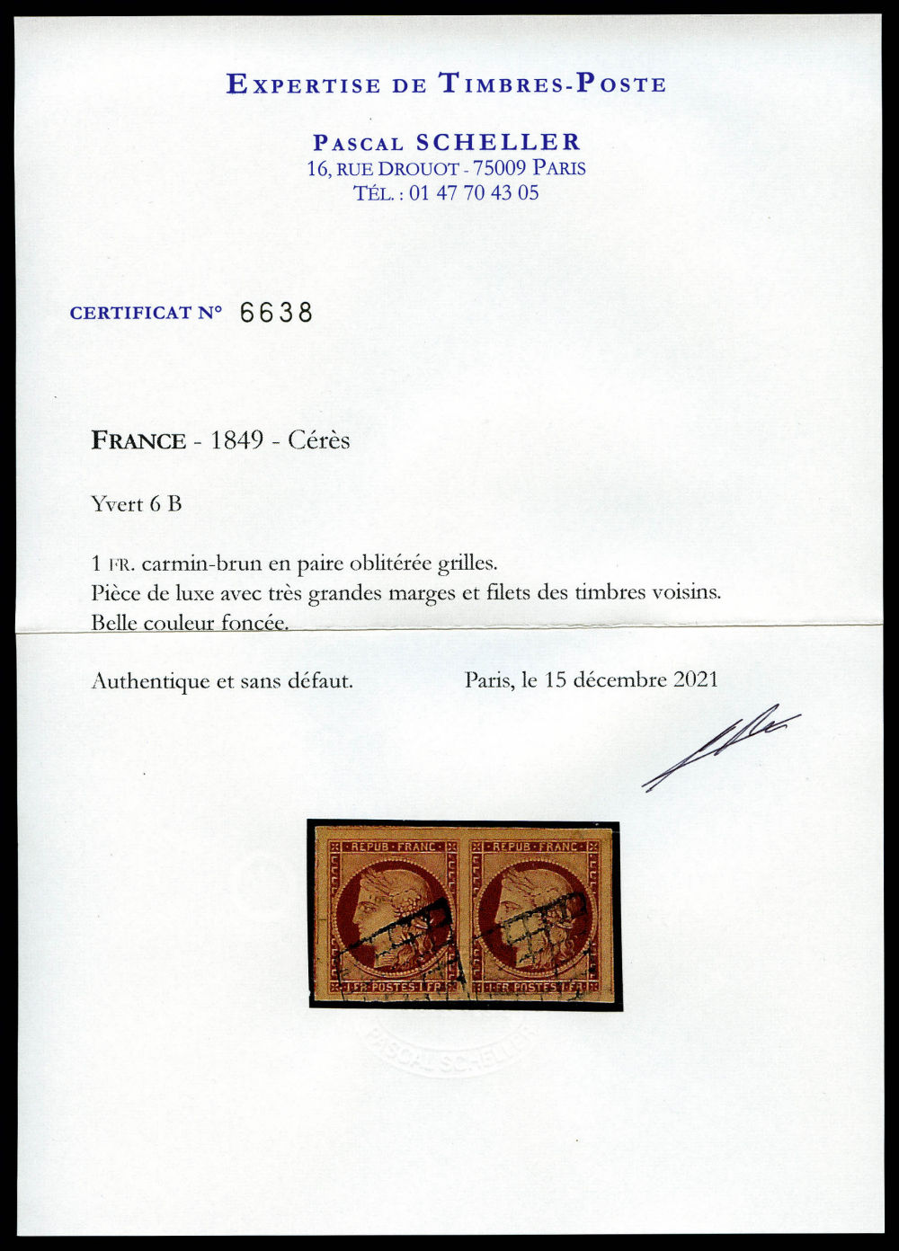 N°6B, 1f carmin brun en paire avec superbes marges et voisins sur trois côtés. PIECE CHOISIE. (Signé Calves/Scheller/certificat) Qualité: Oblitéré (Image) (imagea)
