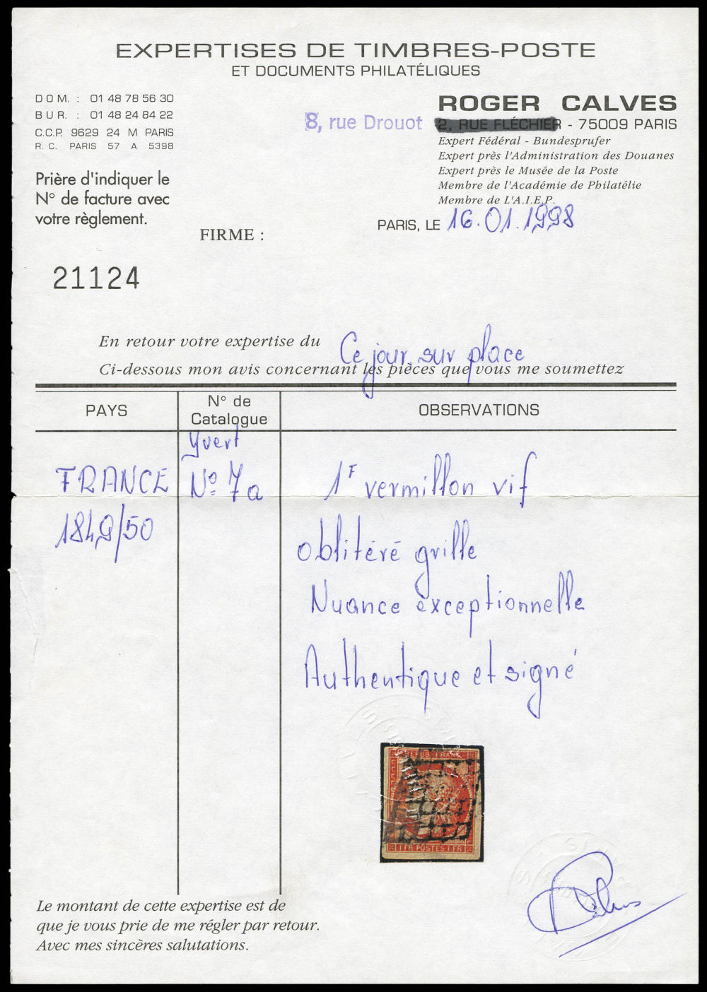 N°7a, 1f Vermillon vif, oblitéré grille, nuance exceptionnelle. TTB. R.R.R (signé Calves/certificats) Qualité: Oblitéré Cote: 27500 euros (Image) (imagea)