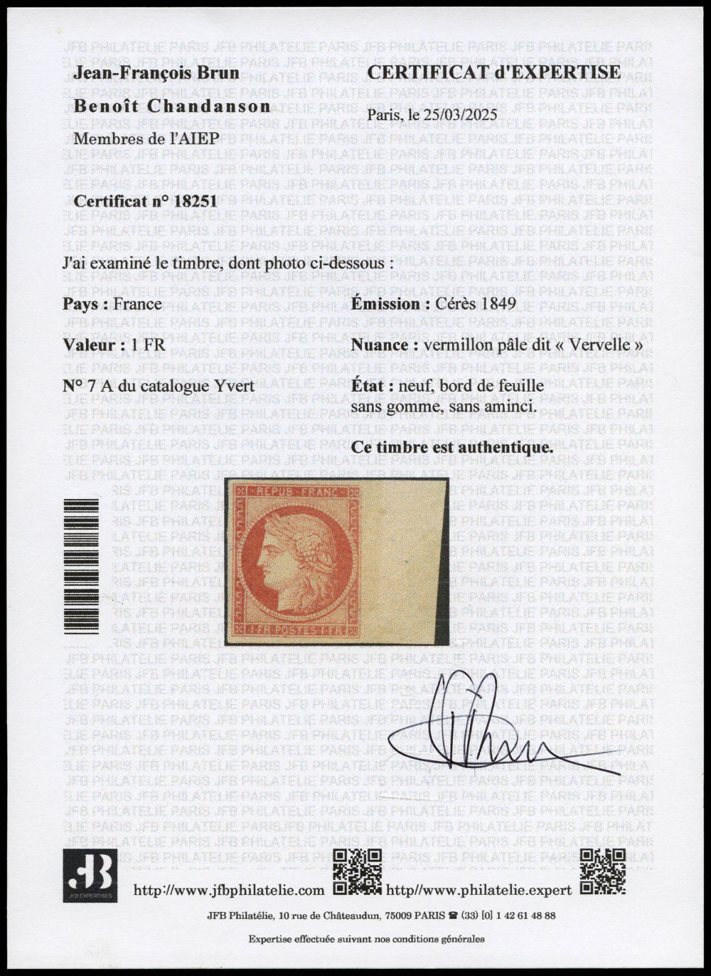 N°7A, 1 fr vermillon pâle dit 'vervelle' nuance vive, sans aminci, exemplaire avec fond de sureté, bord de feuille avec ligne d'encadrement, fraîcheur postale, une des plus belle pièce connue. SUPERBE. R.R. (signé