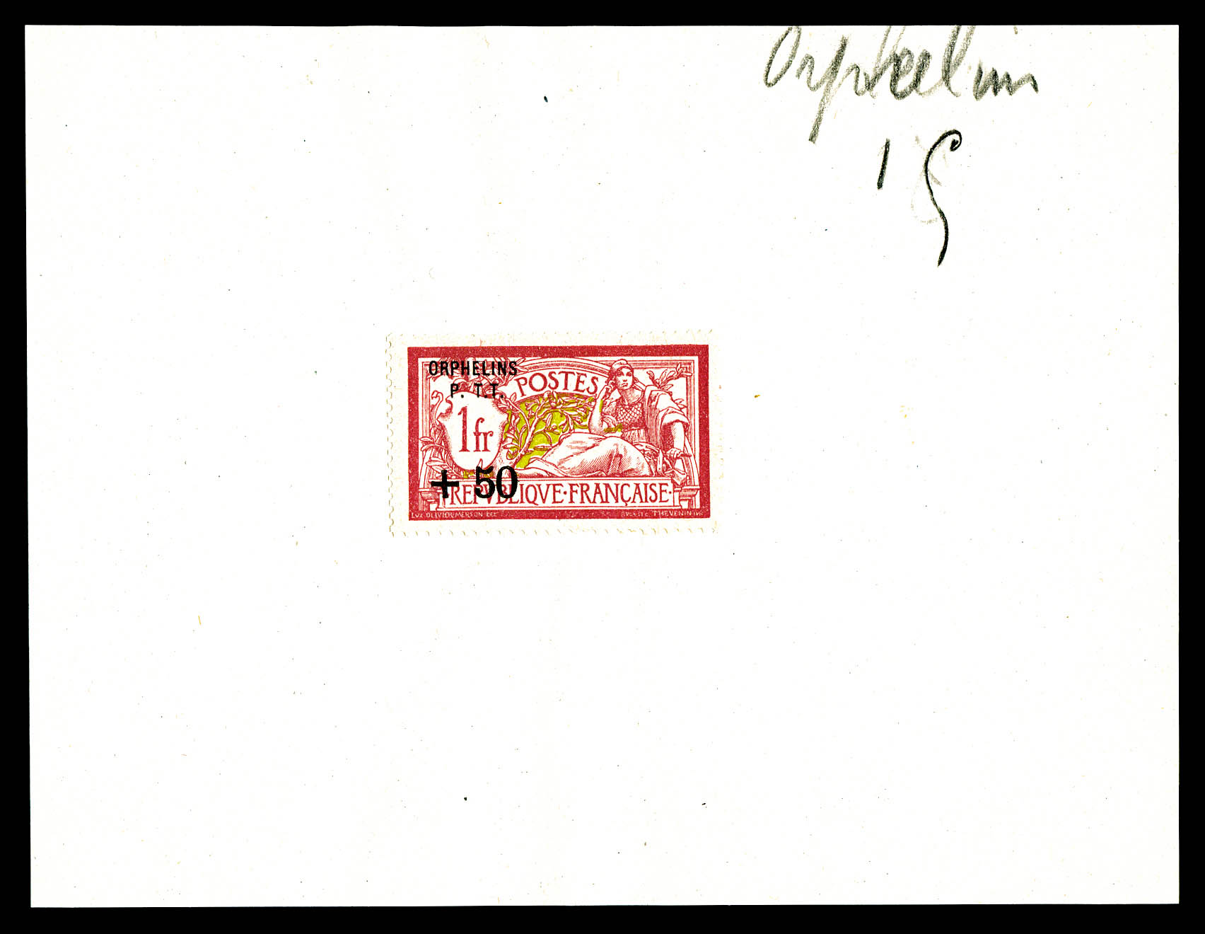 Non émis: Merson 1F +50 surchargé 'ORPHELINS P.T.T' en noir sur feuillet, SEULE PIECE CONNUE. SUPERBE (certificats) Qualité: (*)