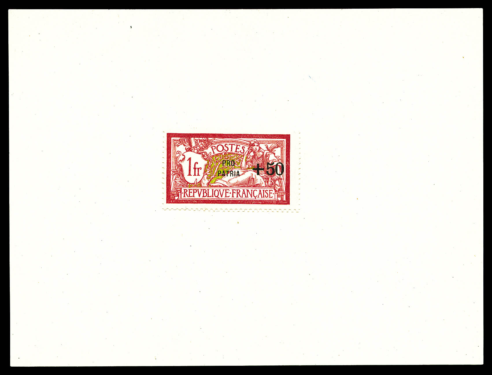 Maury N°3G, Non émis: Merson 1f +50 surchargé 'PRO PATRIA' en noir sur feuillet de présentation, SEULE PIECE CONNUE. SUPERBE
